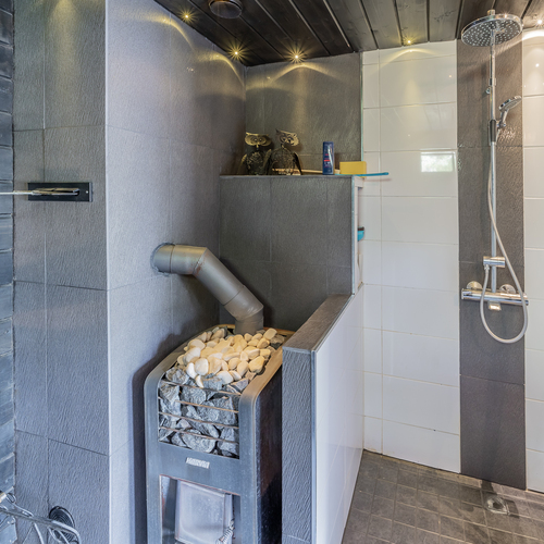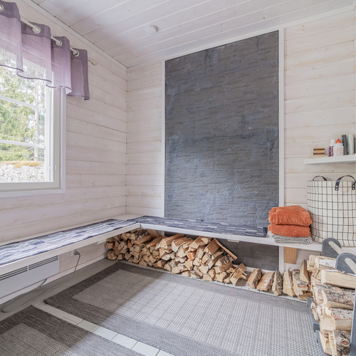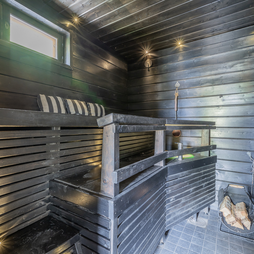 Saunassa puulämmitteinen kiuas, ikkuna, suihku, suihkuseinä, seinillä paneeli, laattalattia, lattialämmitys; saunakamarissa lautalattia, seinillä paneeli/koristelaatta, ikkuna
