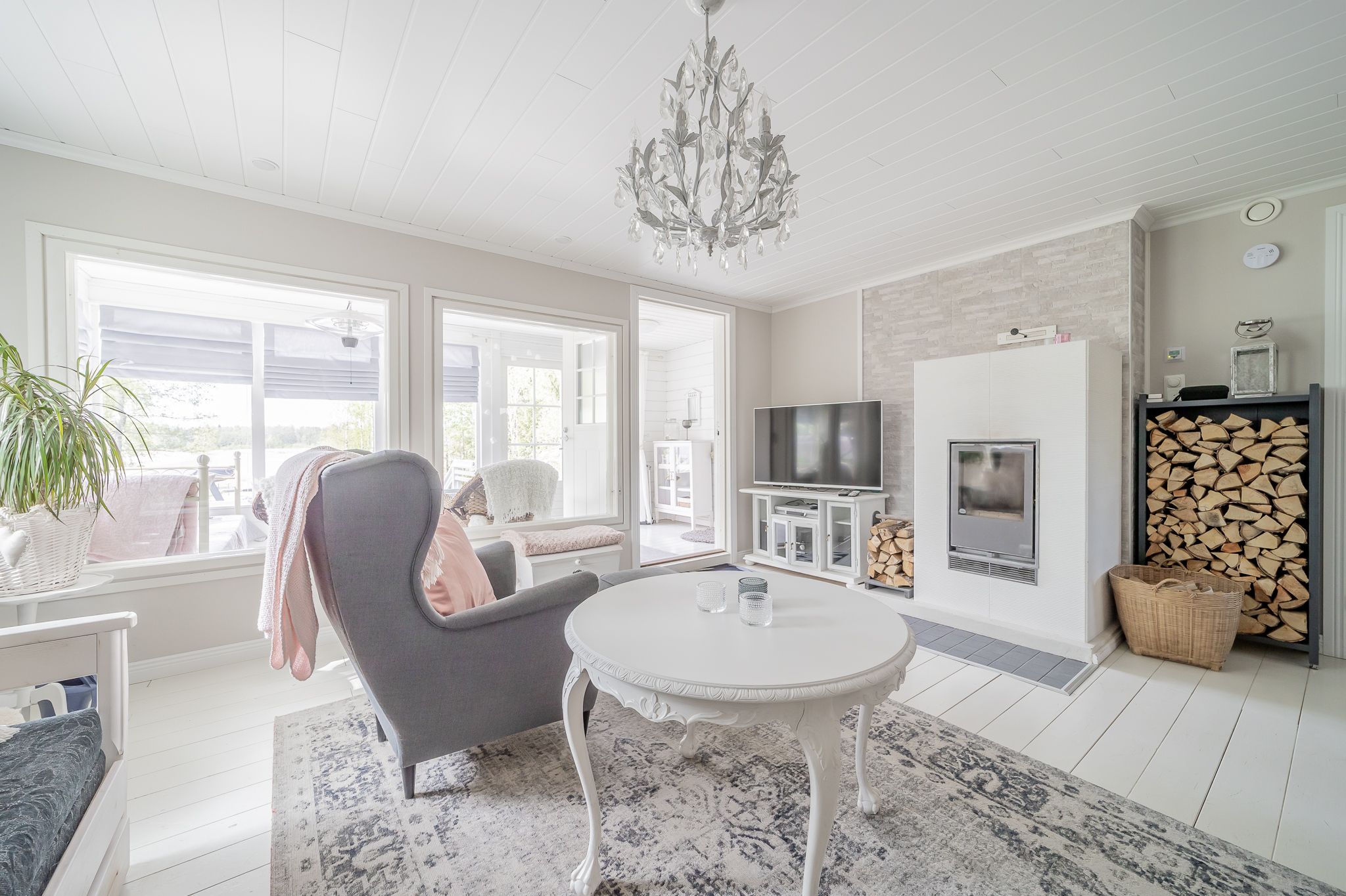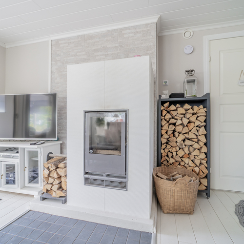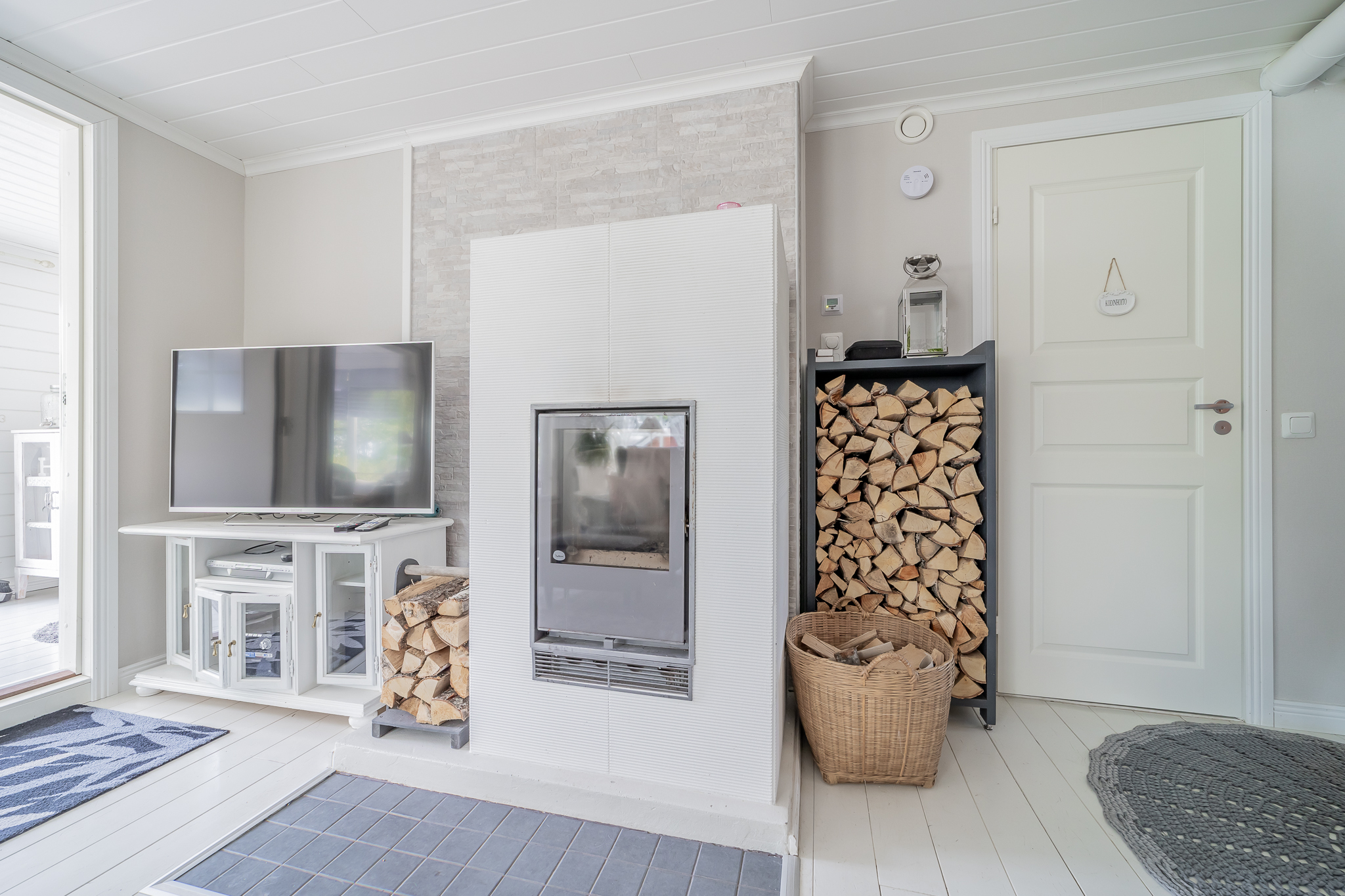 Olohuoneessa varaava Tulikiven takka, seinillä tapetti, lautalattia, olohuoneesta käynti isolle lasiterassille