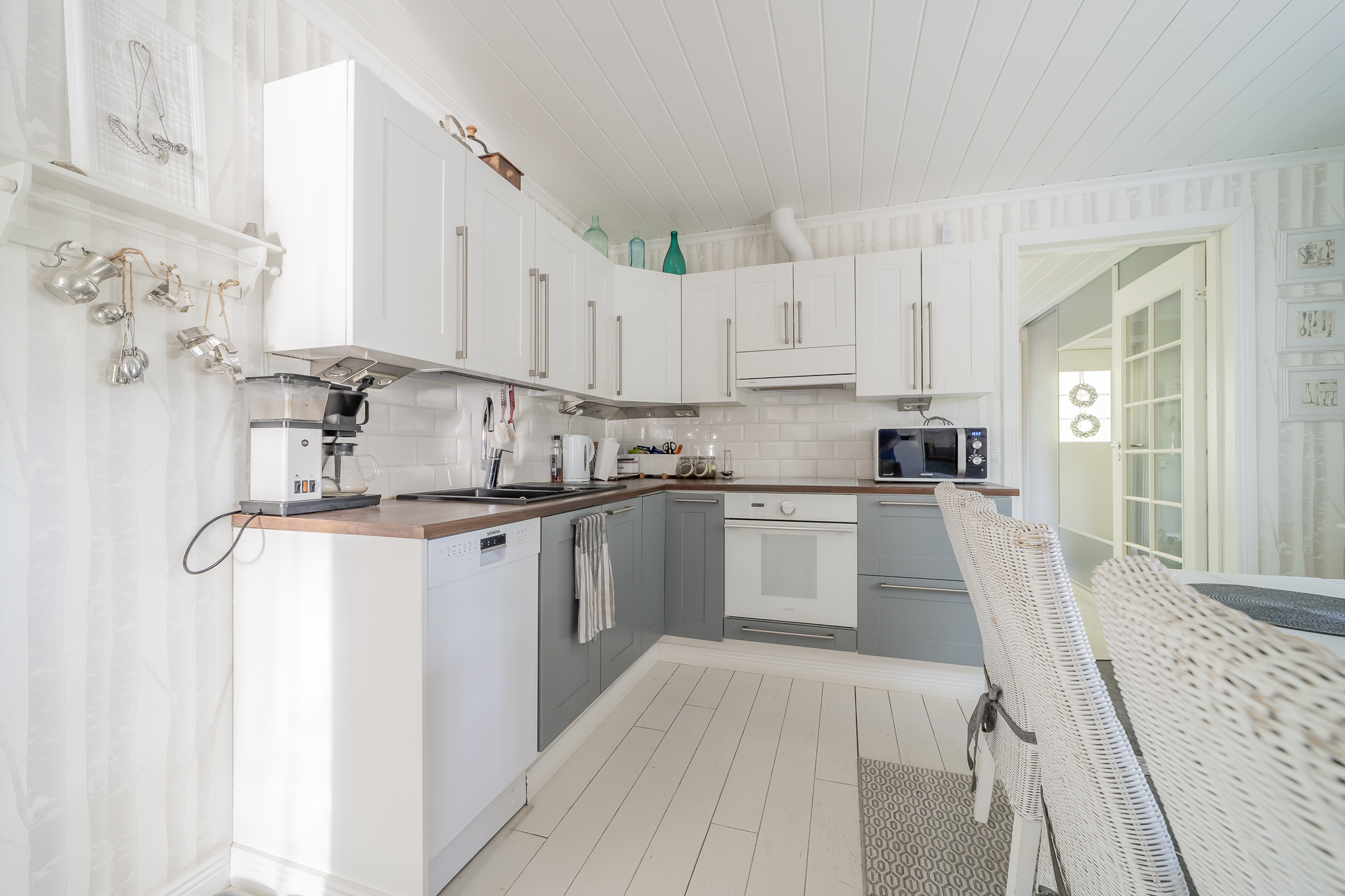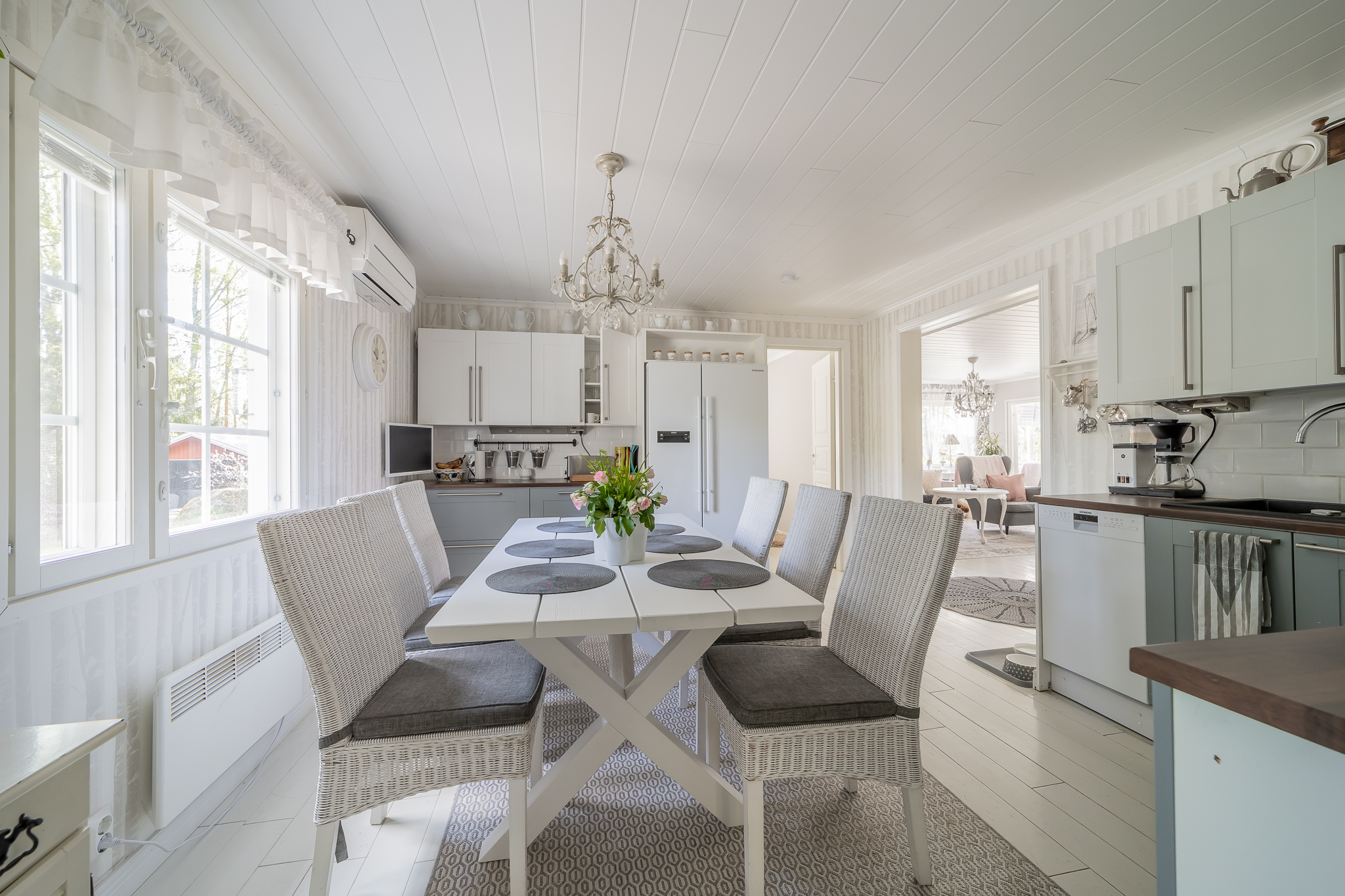Vaaleasävyinen iso keittiö, jääkaappipakastin, induktioliesitaso, erillisuuni, liesituuletin, astianpesukone, ilmalämpöpumppu, keittiöön mahtuu iso ruokapöytä, seinillä tapetti, lautalattia