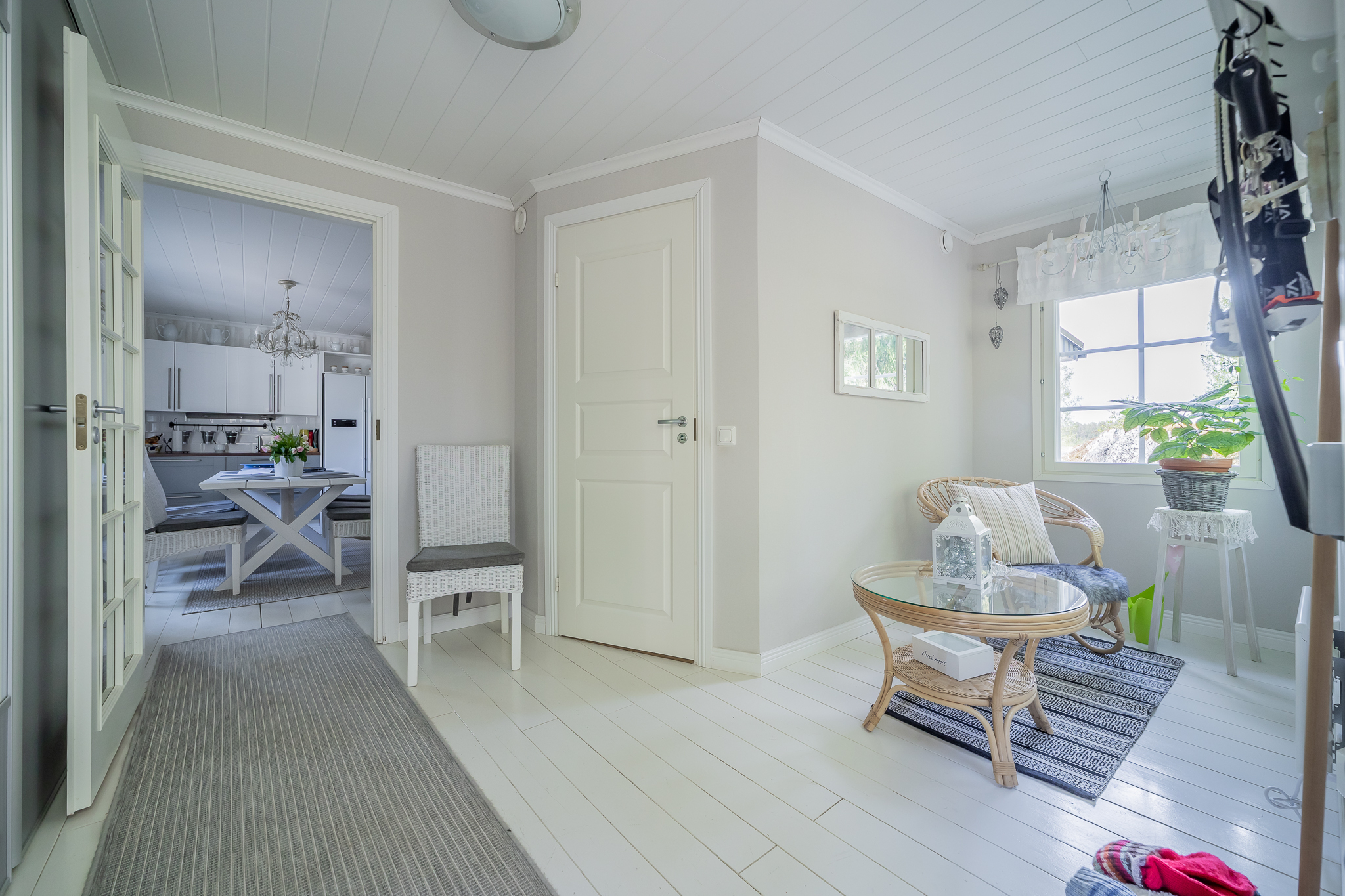 Tilava, upein liukuovin ja monin ikkunoin varustettu eteistila toivottaa tulijansa tervetulleeksi, joten käydään peremmälle… eteistilassa on myös kalustettu wc.