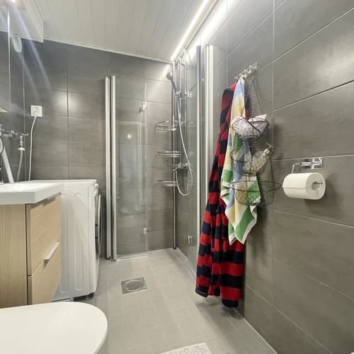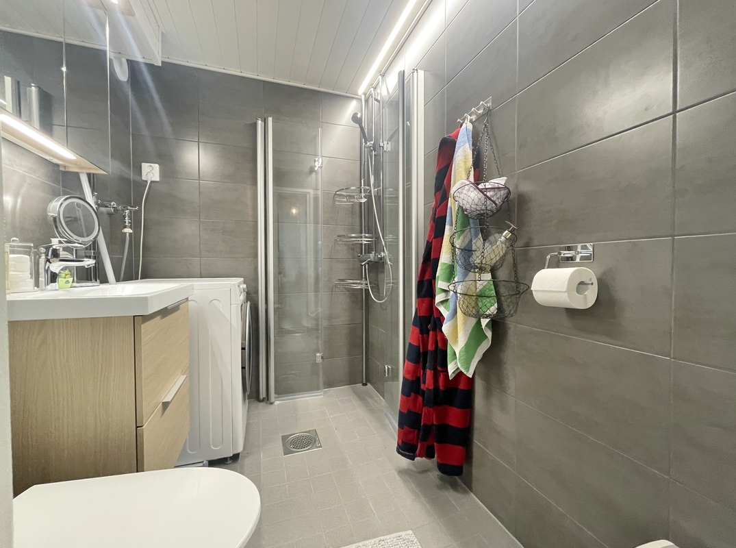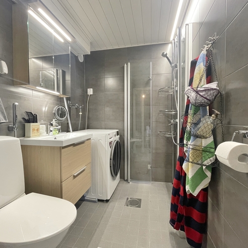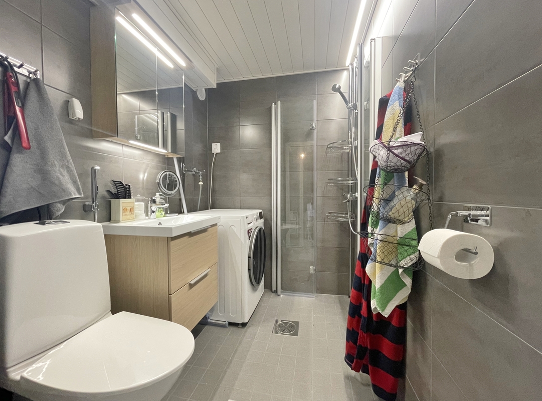 Varusteet: suihku, suihkuseinä, peilikaappi, allaskaappi, pesukoneliitäntä