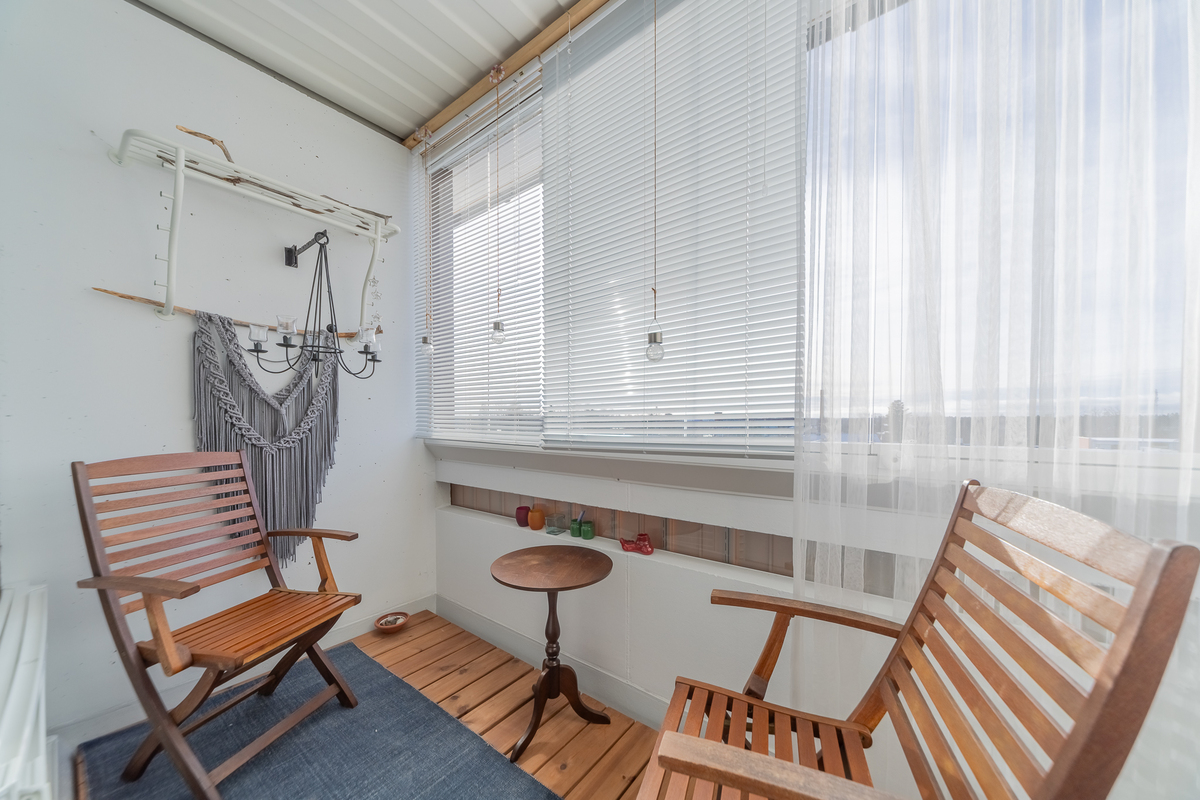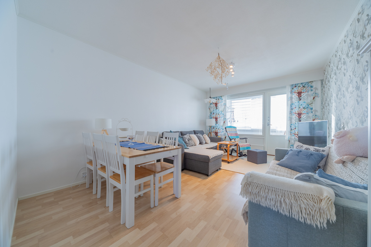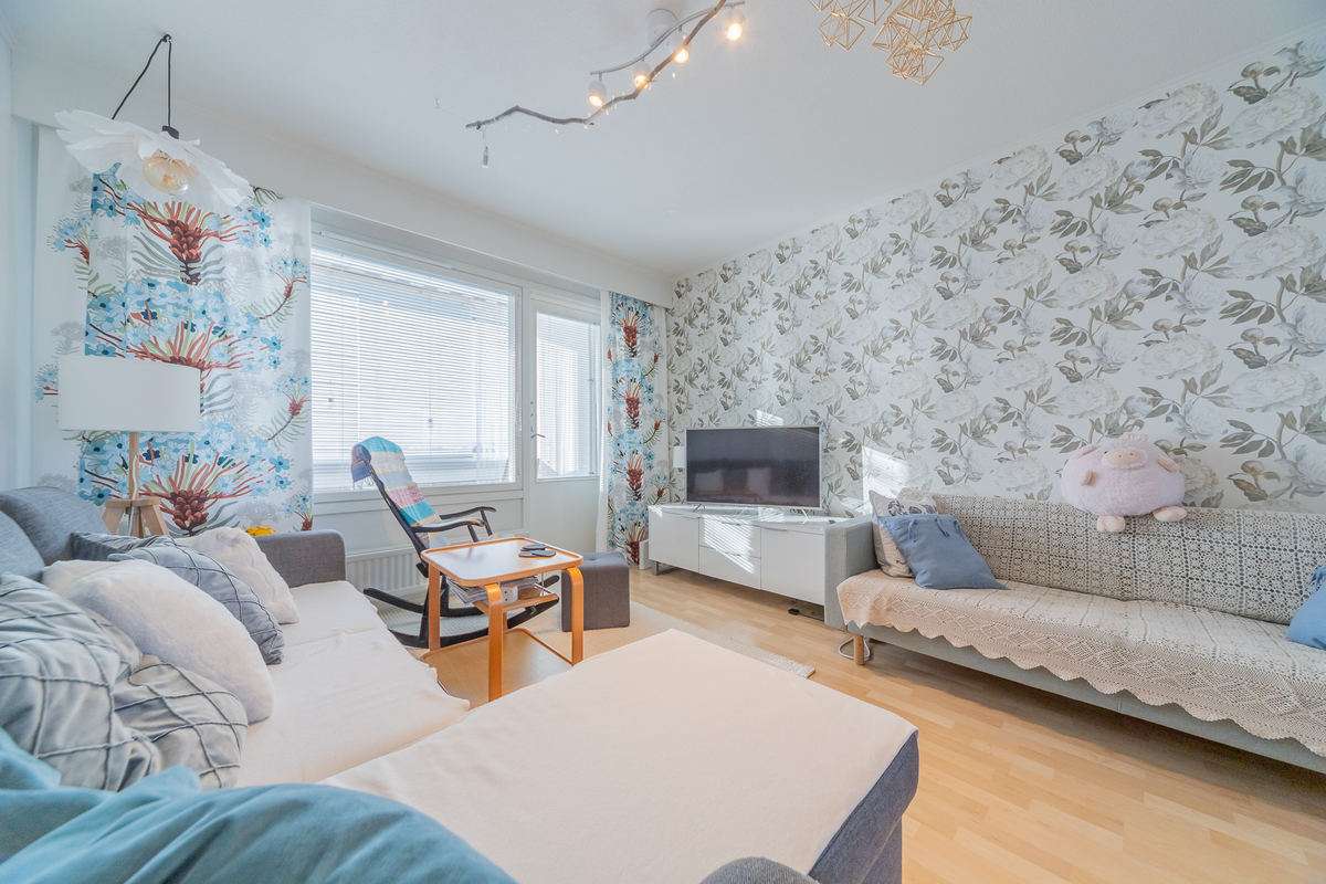 Valoisa ja tilava olohuone, josta pääsee pujahtamaan etelänsuuntaiselle lasitetulle parvekkeelle.