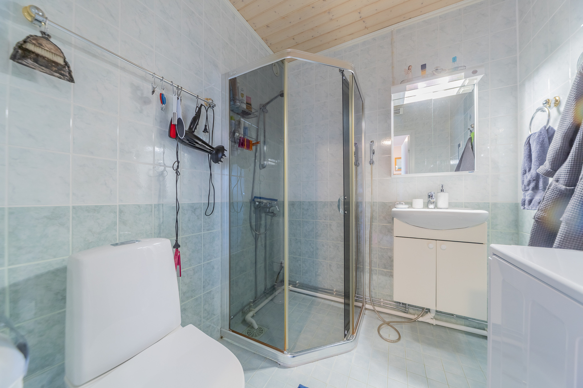 Kalustettuun kylpyhuoneeseen asennettu suihkukaappi pitää lattian kuivana, kylpyhuoneessa paikka myös pyykinpesukoneelle.
