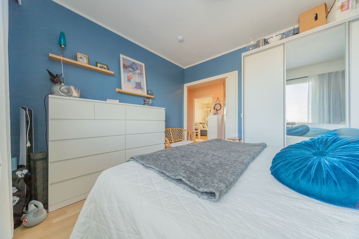 Makuuhuoneeseen on asennettu kaapistoa, lisätilaa säilytykseen tarjoaa eteistilan vaatehuone.