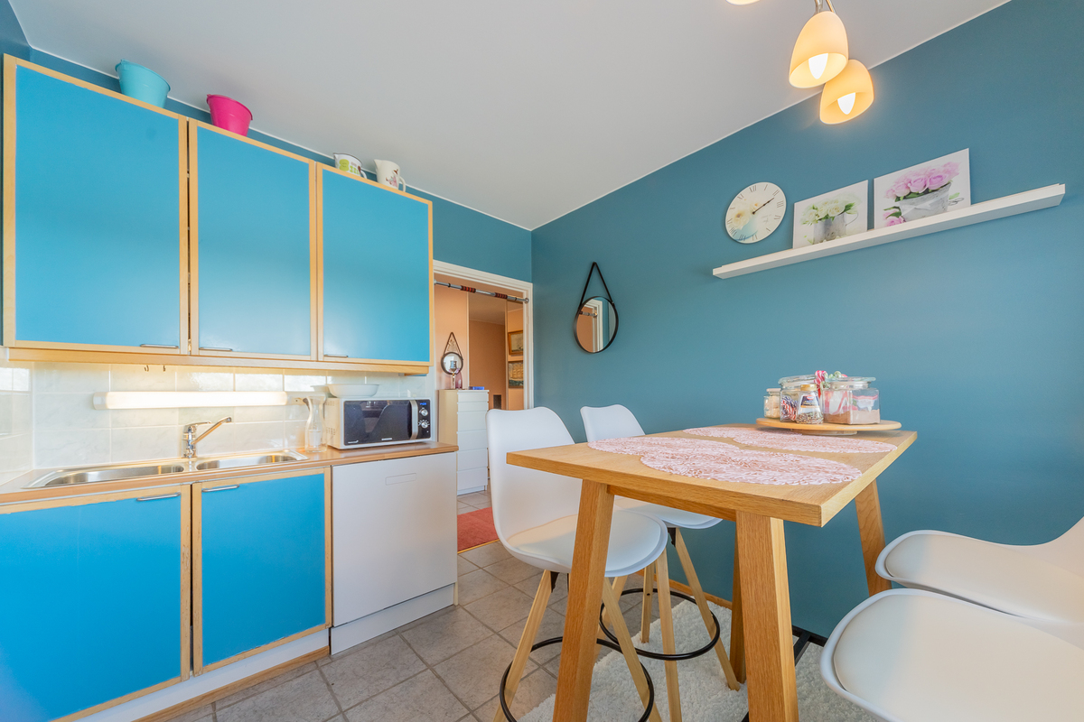 Olohuonetta vastapäätä on keittiö, jossa hyväkuntoiset kodinkoneet ja paikka ruokapöydälle.