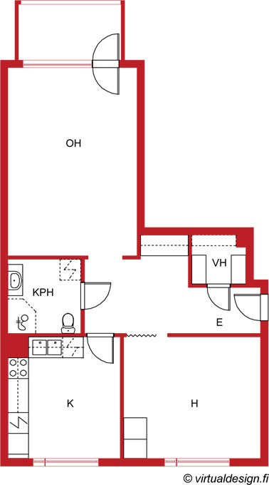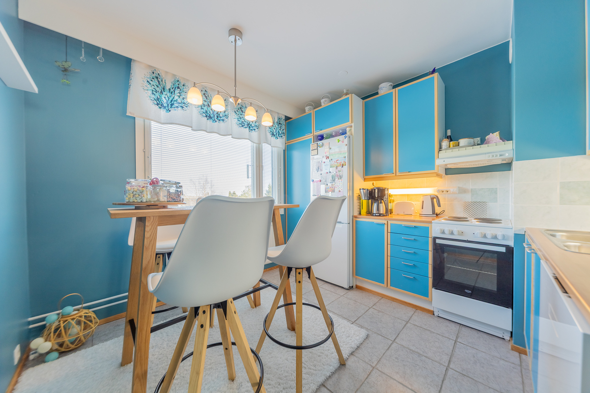 Jääkaappipakastin, liesi (2017), liesituuletin, astianpesukone (2020), maalatut seinät, laattalattia
