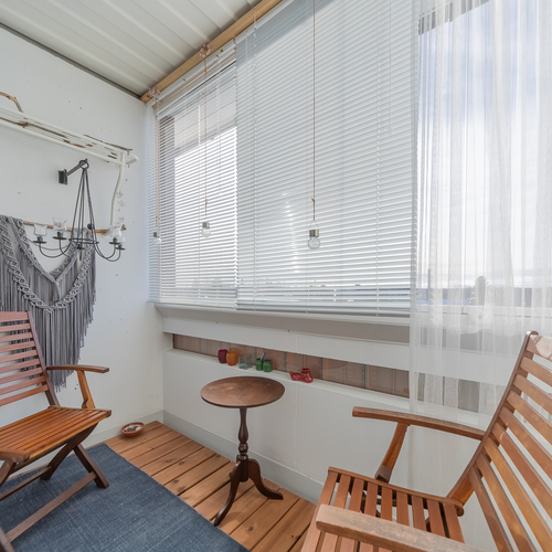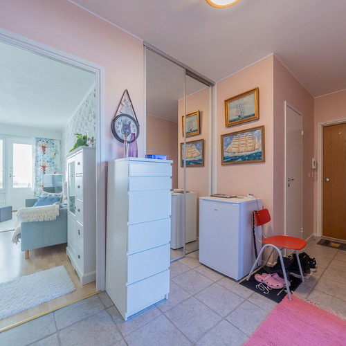 Olohuoneesta käynti etelänsuuntaiselle lasitetulle parvekkeelle, seinillä tapetti/maali, laminaattilattia