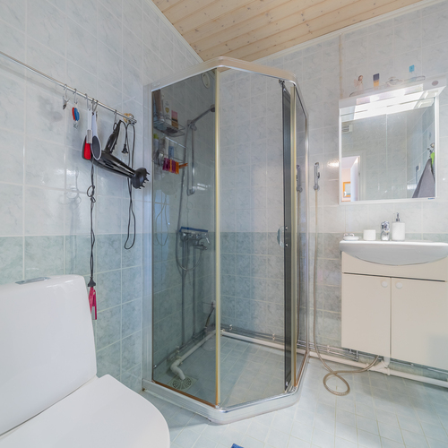Kalustettuun kylpyhuoneeseen asennettu suihkukaappi pitää lattian kuivana, kylpyhuoneessa paikka myös pyykinpesukoneelle.