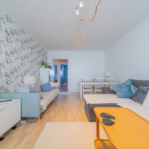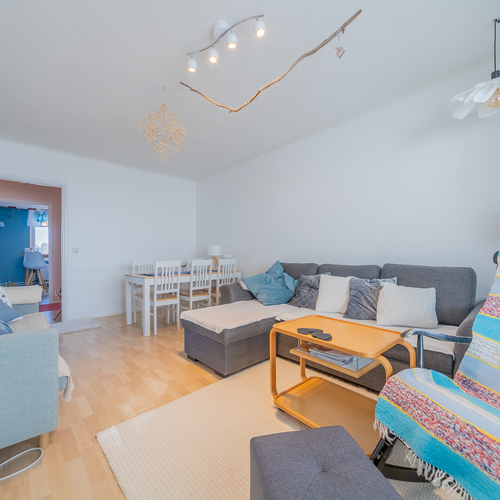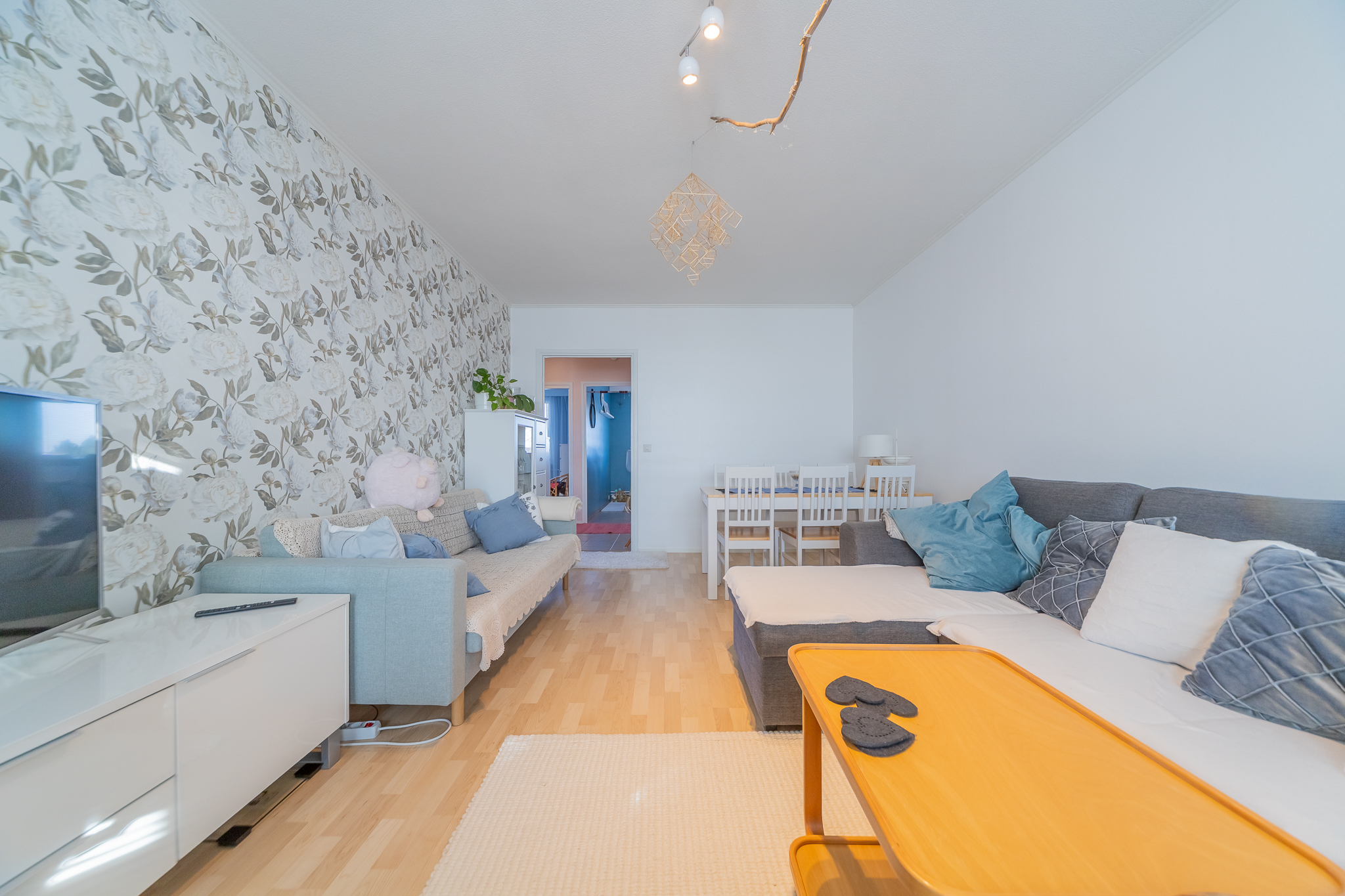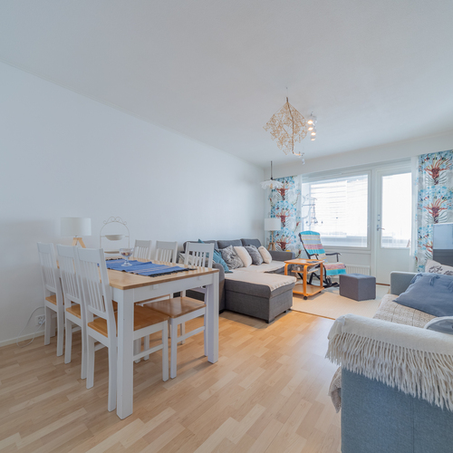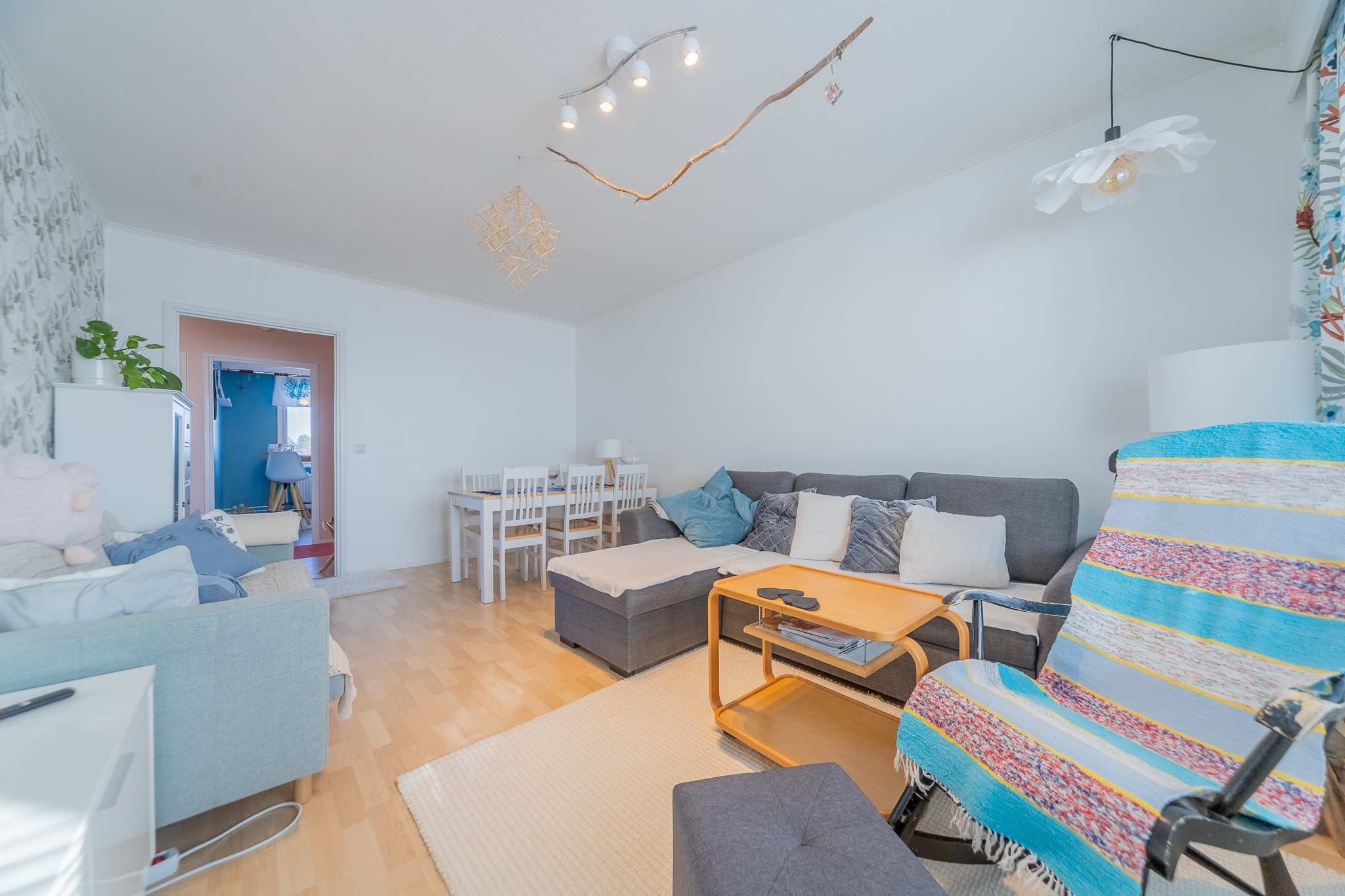 Valoisa ja tilava olohuone, josta pääsee pujahtamaan etelänsuuntaiselle lasitetulle parvekkeelle.