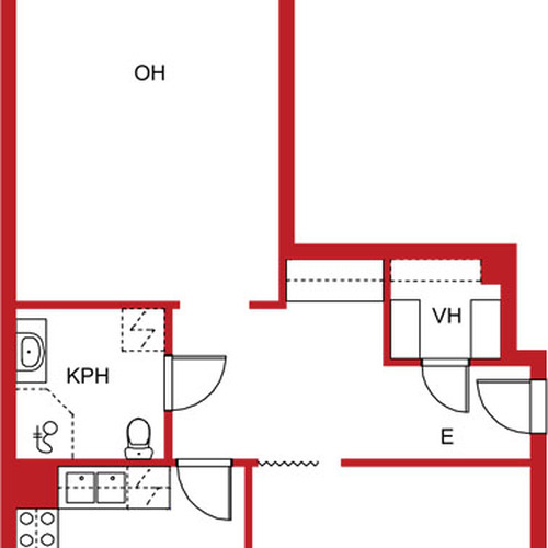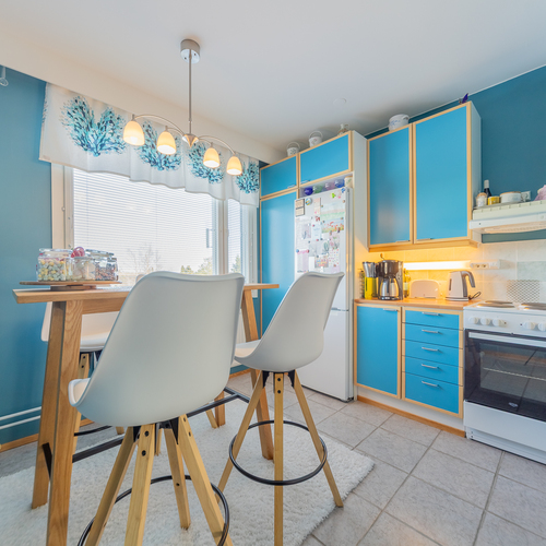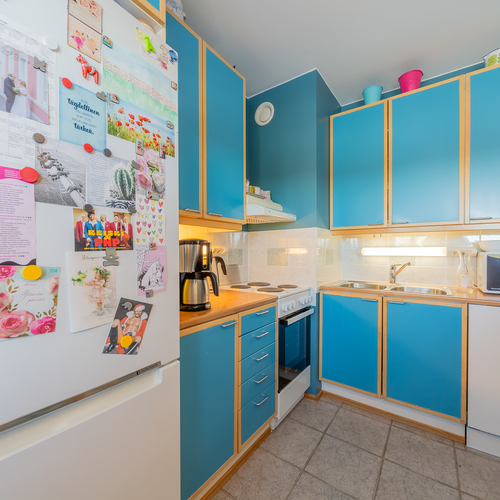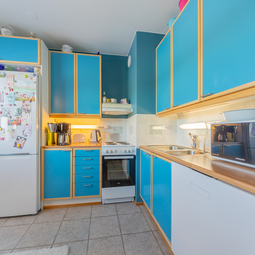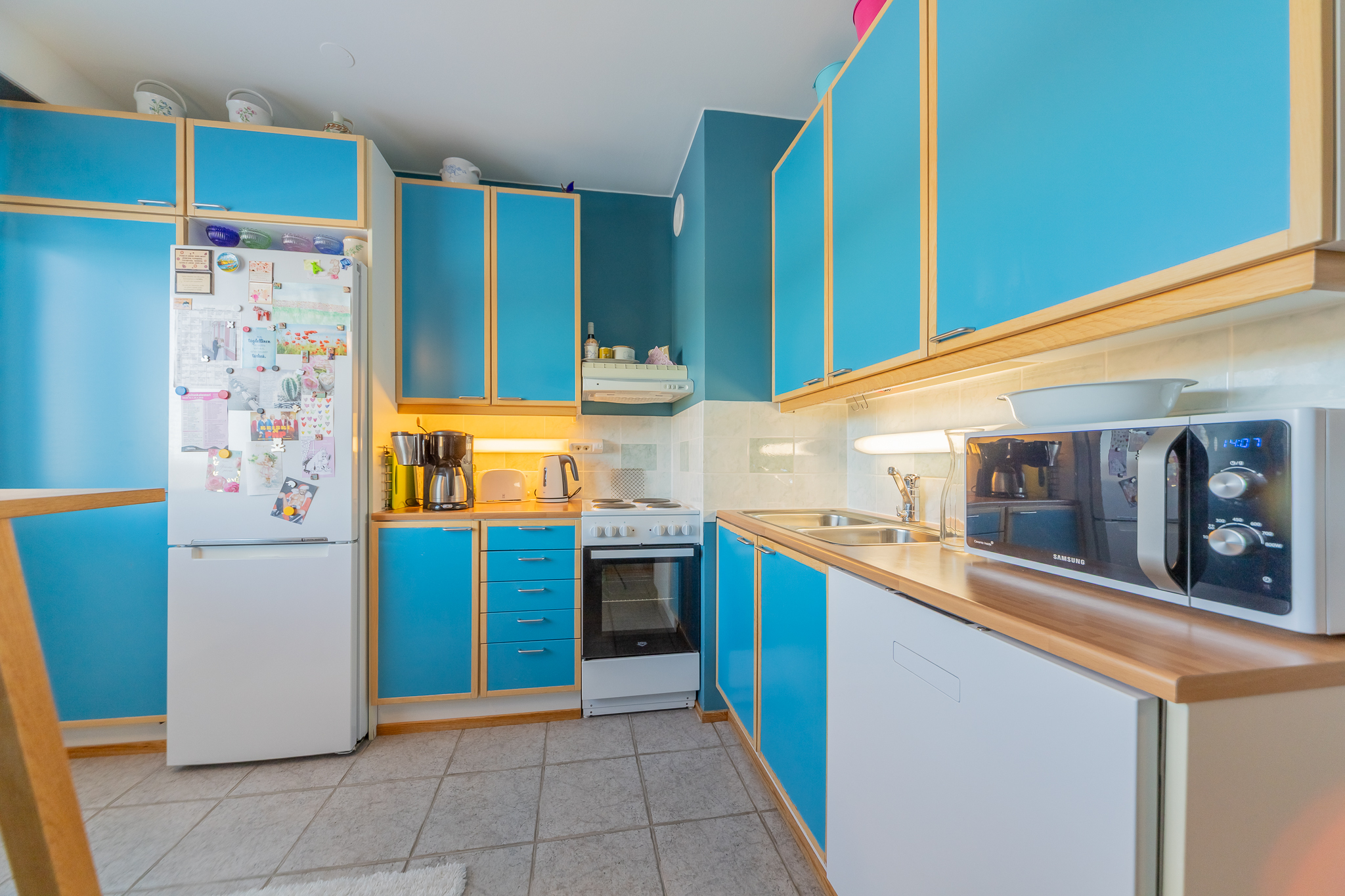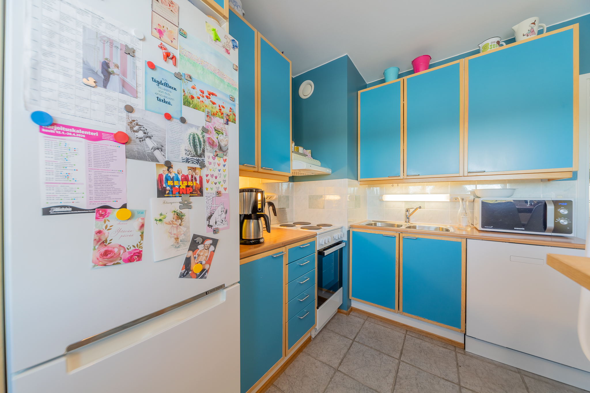 Jääkaappipakastin, liesi (2017), liesituuletin, astianpesukone (2020), maalatut seinät, laattalattia