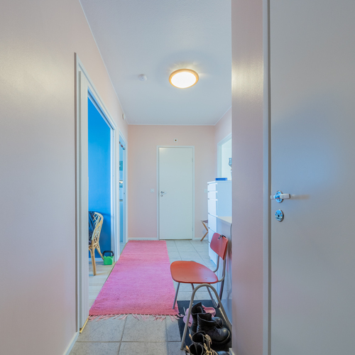 Eteistilassa vaatehuone, seinillä maali, laattalattia