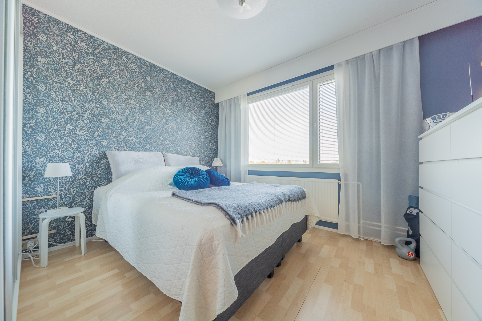 Makuuhuoneeseen on asennettu kaapistoa, lisätilaa säilytykseen tarjoaa eteistilan vaatehuone.