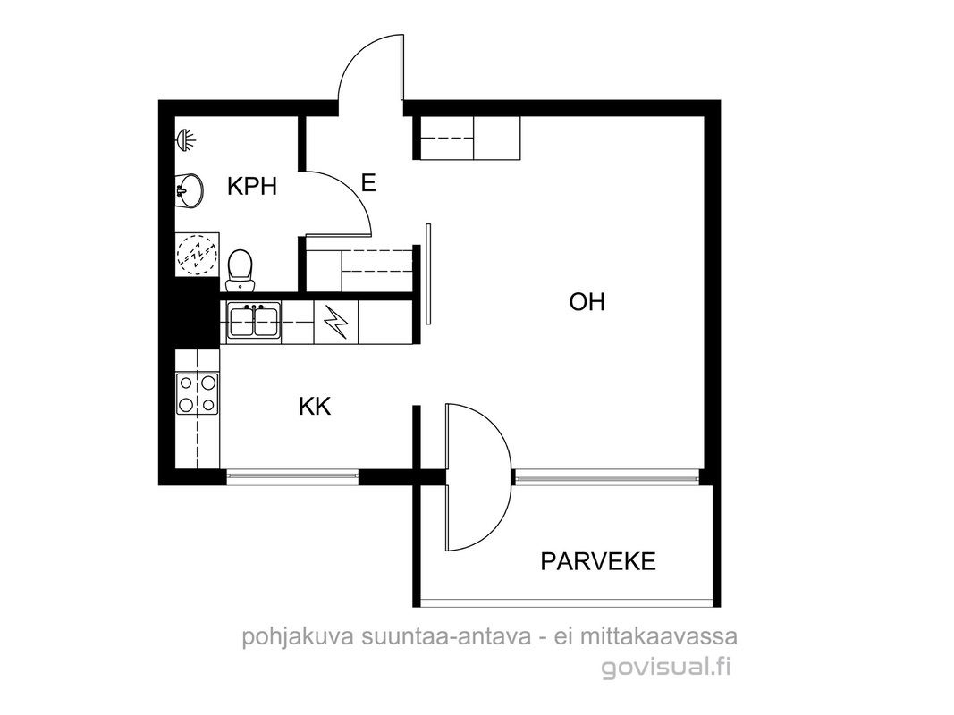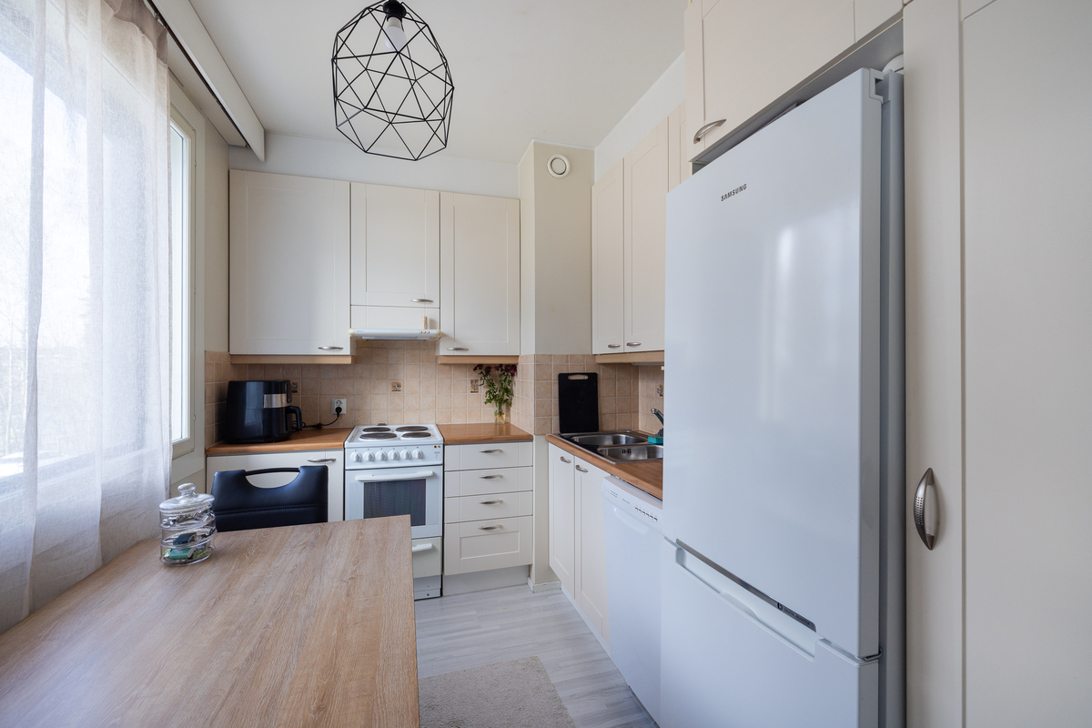Sähköliesi, liesituuletin (suodatin), jääpakastinkaappi, astianpesukone. MDF-tasot. Kiinteät valaisimet. Lattia laminaattia seinät ja katto maalattu.