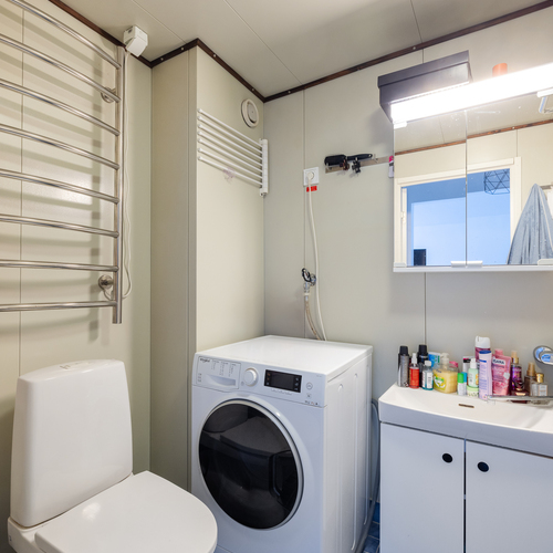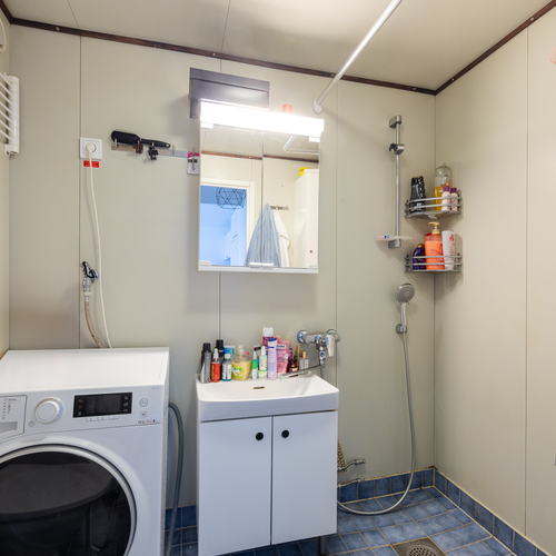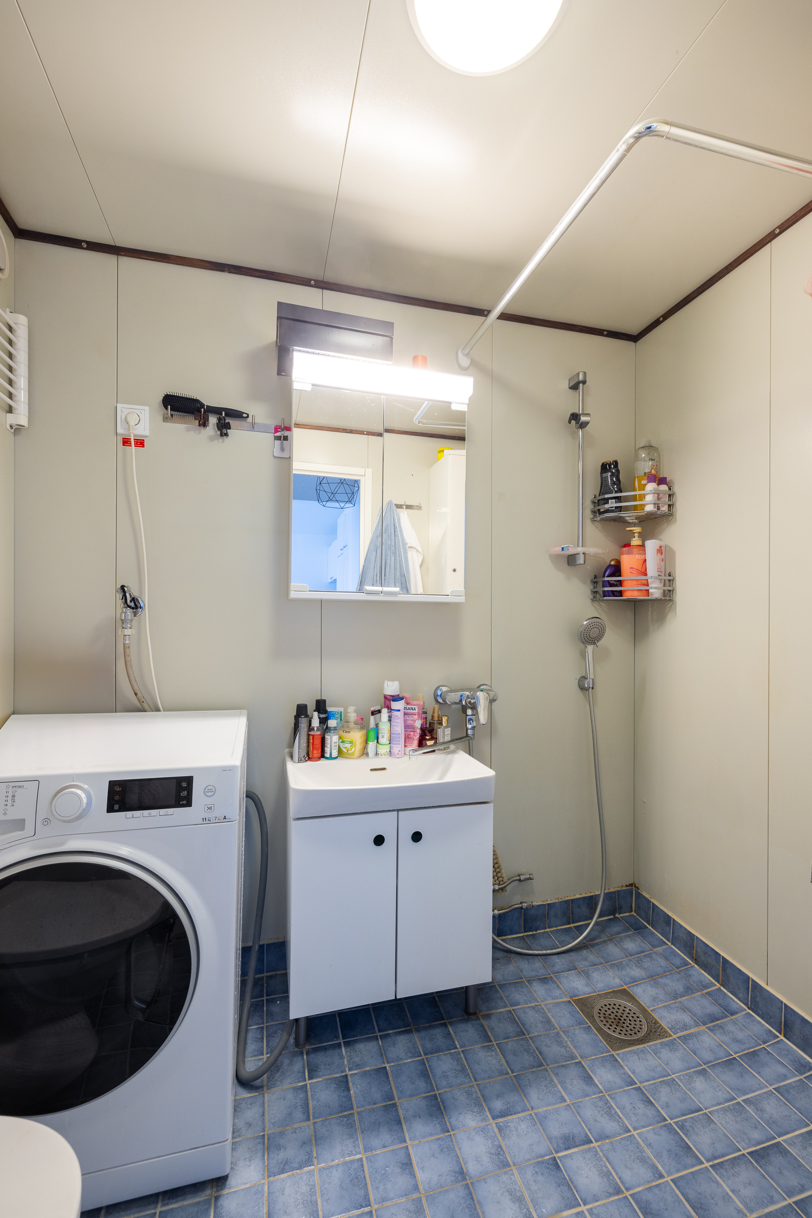 Suihku, allaskaappi, peilikaappi, pesukoneliitäntä, wc-istuin, pyyhekuivain. Kiinteät valaisimet. Lattia laatoitettu, seinät ja katto muovipintaista peltielementtiä.