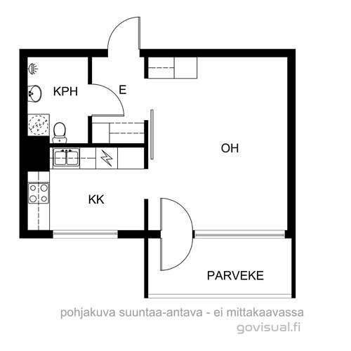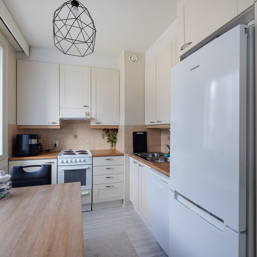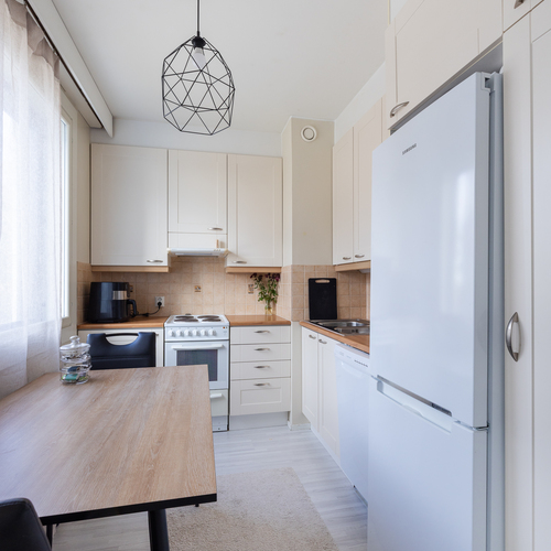 Sähköliesi, liesituuletin (suodatin), jääpakastinkaappi, astianpesukone. MDF-tasot. Kiinteät valaisimet. Lattia laminaattia seinät ja katto maalattu.