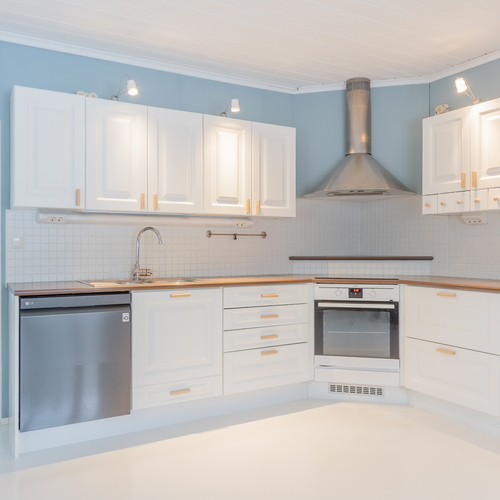 Iso valoisa keittiö, jossa tasokkaat kodinkoneet, paikka isolle ruokapöydälle ja seinälle asennettu ilmalämpöpumppu. Keittiön vieressä kauniilla pönttöuunilla varustettu olohuone, josta pääsee pujahtamaan piha-alueelle.