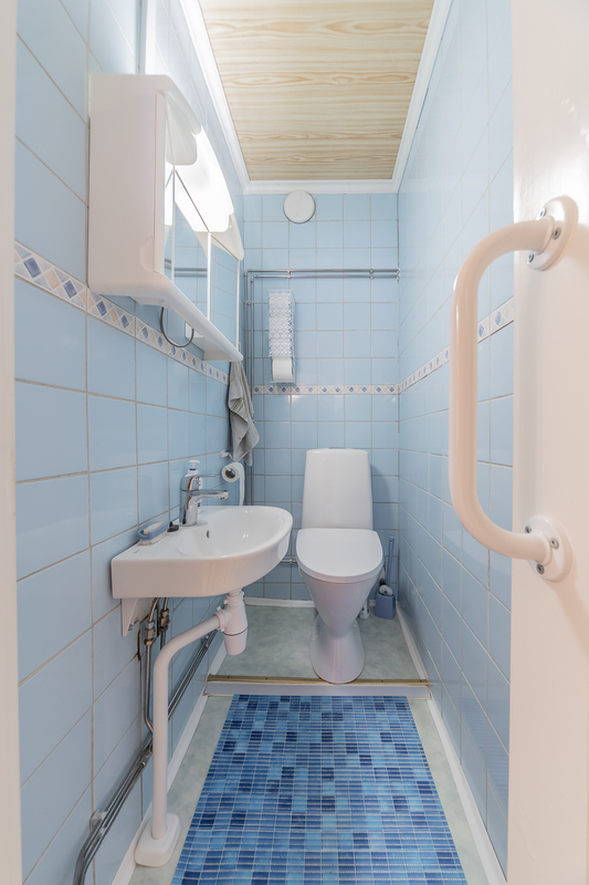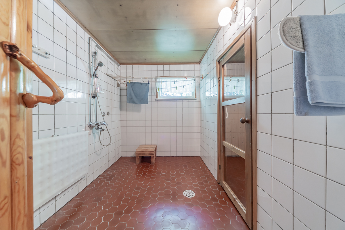 Reilunkokoinen kylpyhuone ja puulämmitteinen sauna, molemmissa ikkunat.