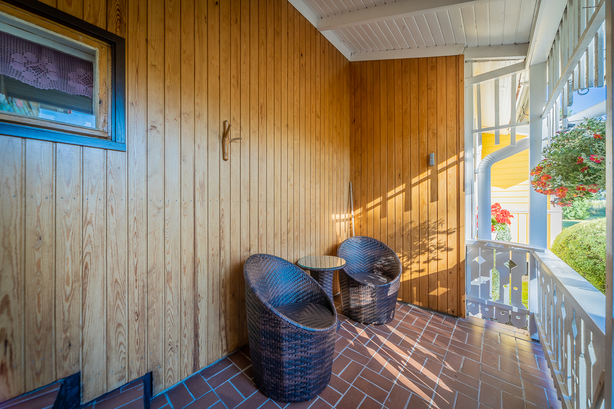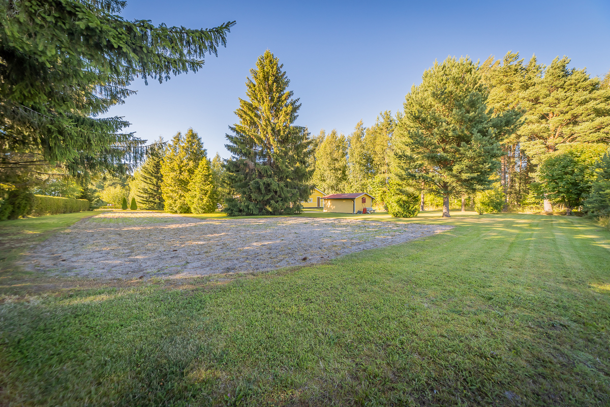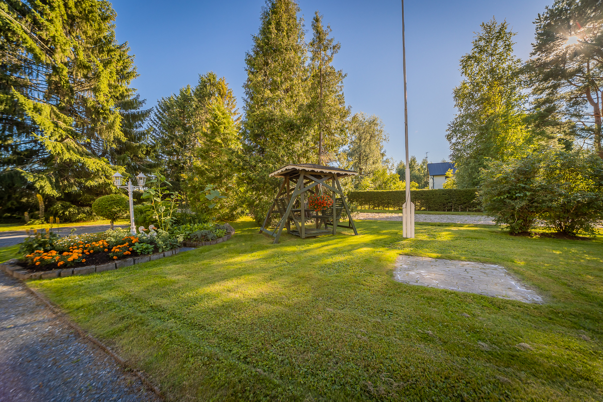 Talon edessä olevalla katetulla terassilla on nautinto istuskella vaikka kahvikupposen äärellä. Iso, osin kuusiaidan suojaama tontti.