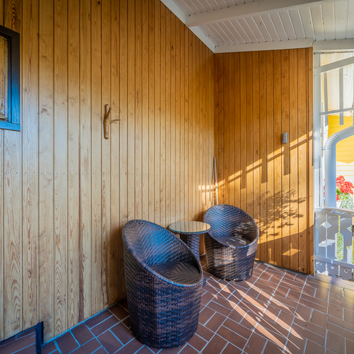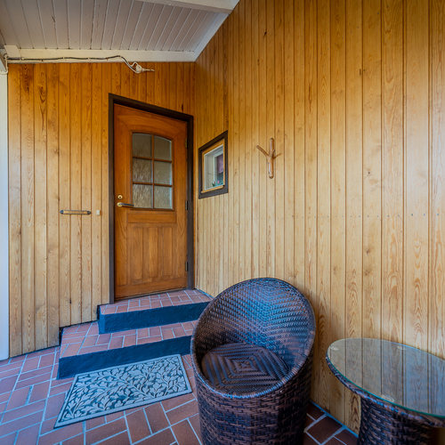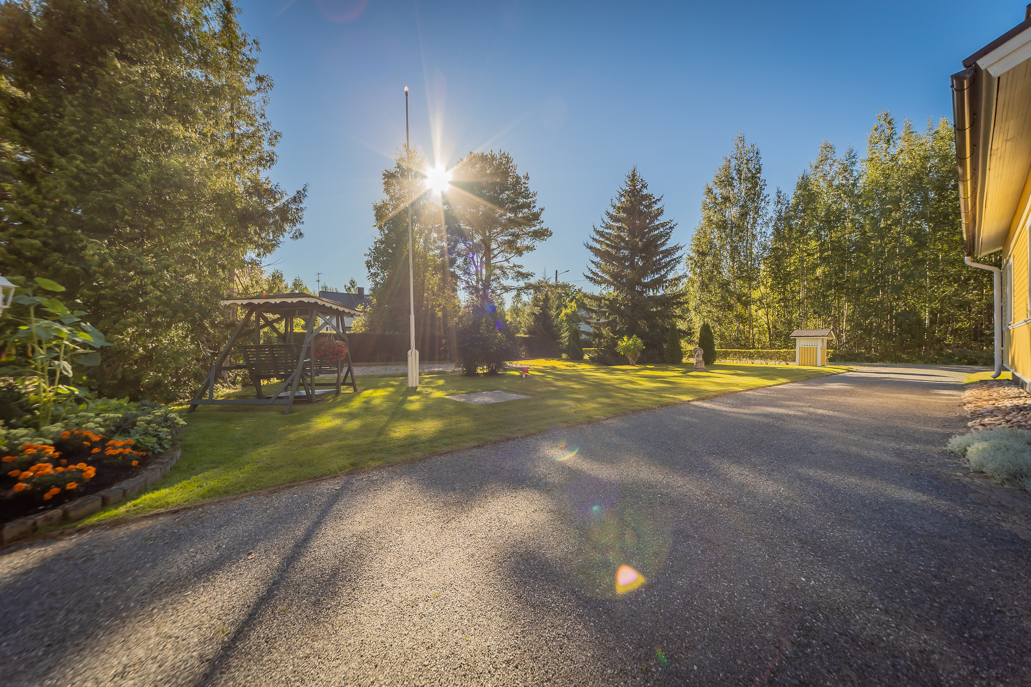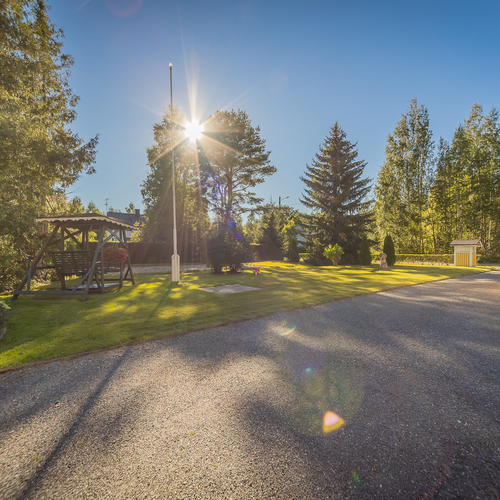 Talon edessä olevalla katetulla terassilla on nautinto istuskella vaikka kahvikupposen äärellä. Iso, osin kuusiaidan suojaama tontti.