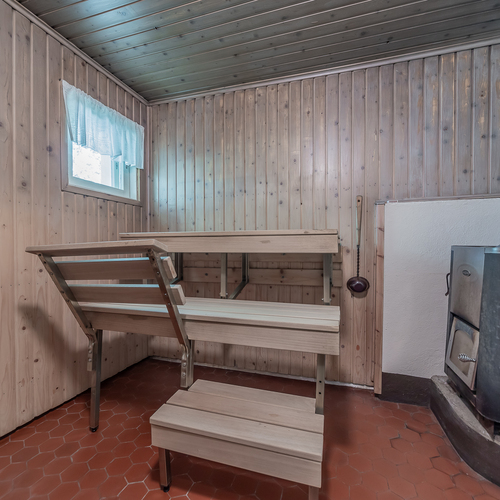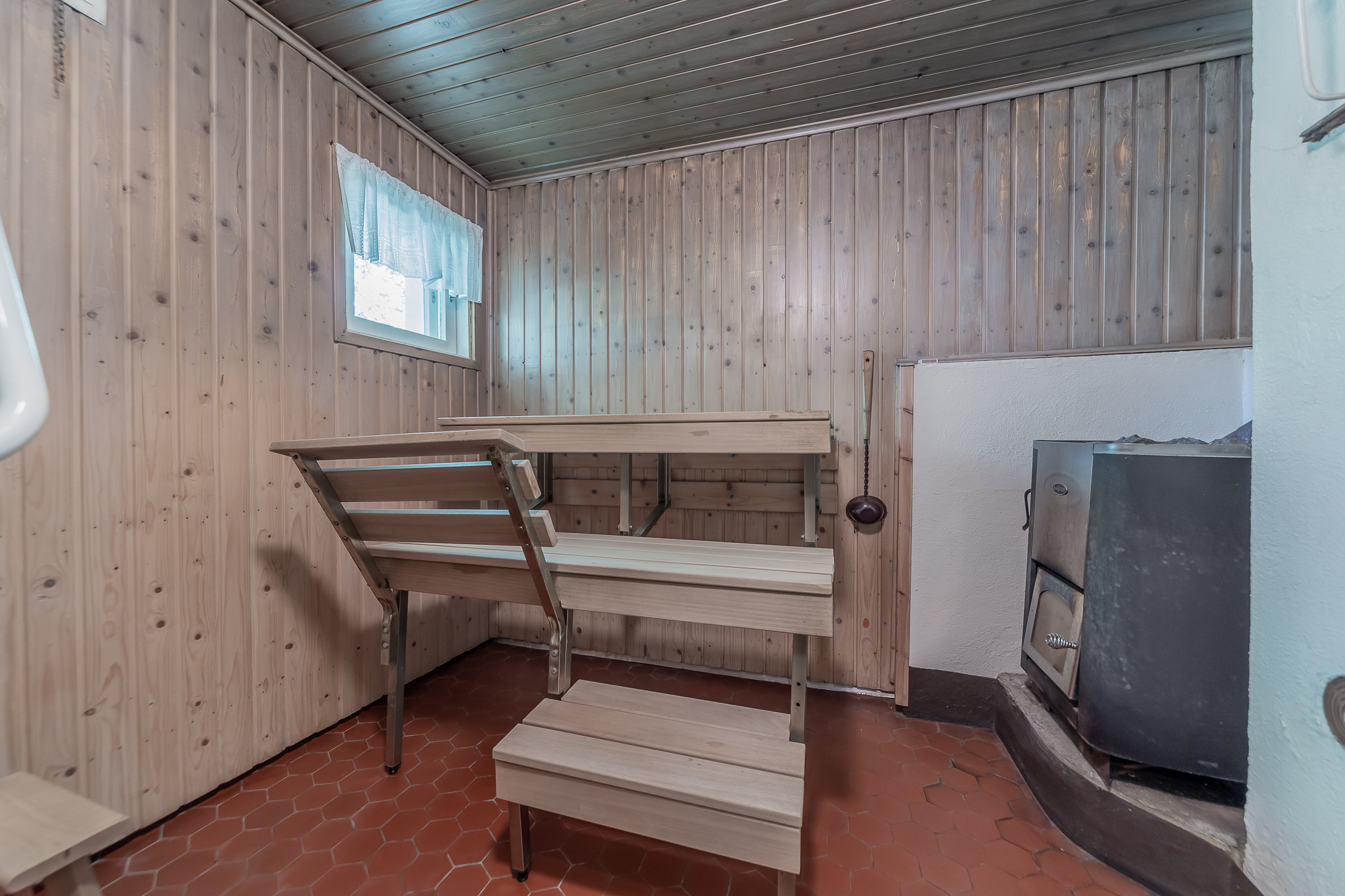 Ikkunallinen puulämmitteinen sauna, paneeliseinät, laattalattia