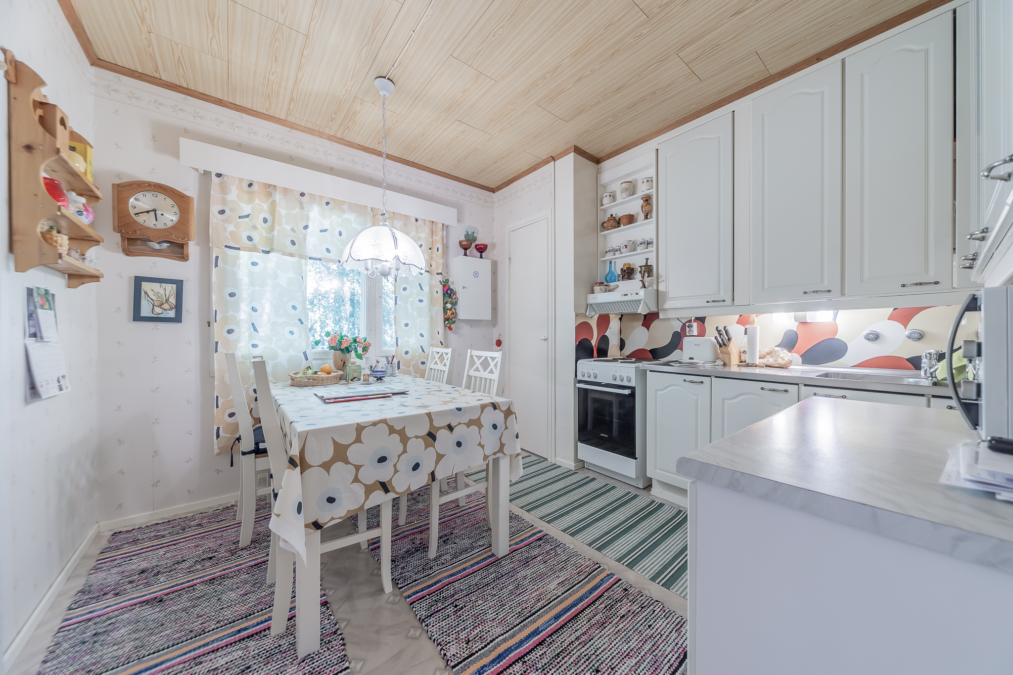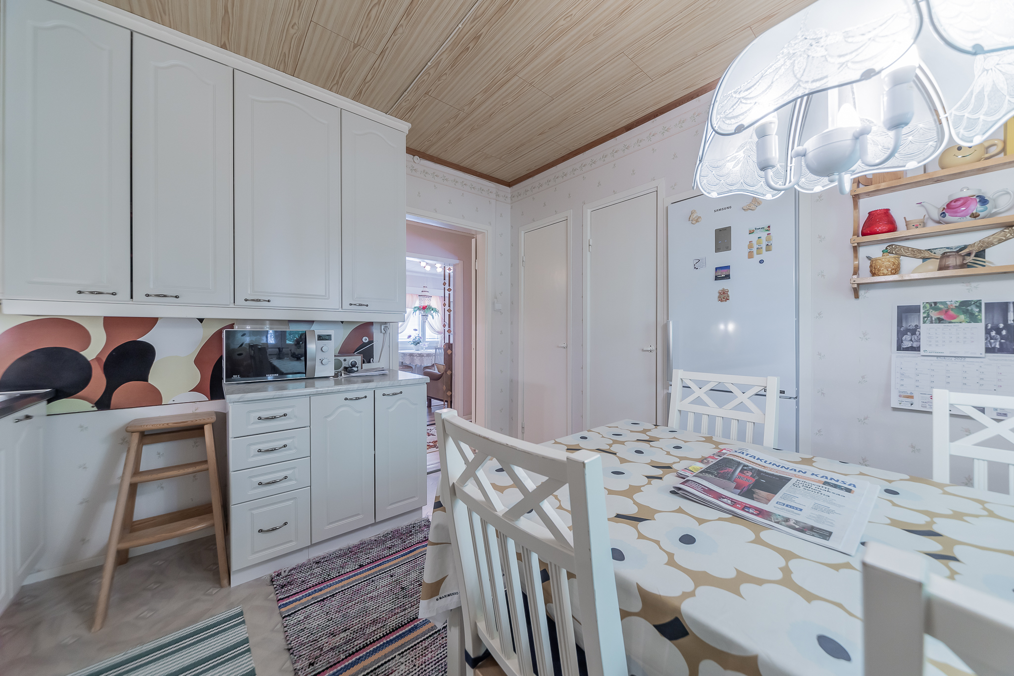 Valoisaan olohuoneeseen on asennettu vuonna 2017 ilmalämpöpumppu. Kodikas keittiö, jossa paikka ruokapöydälle.