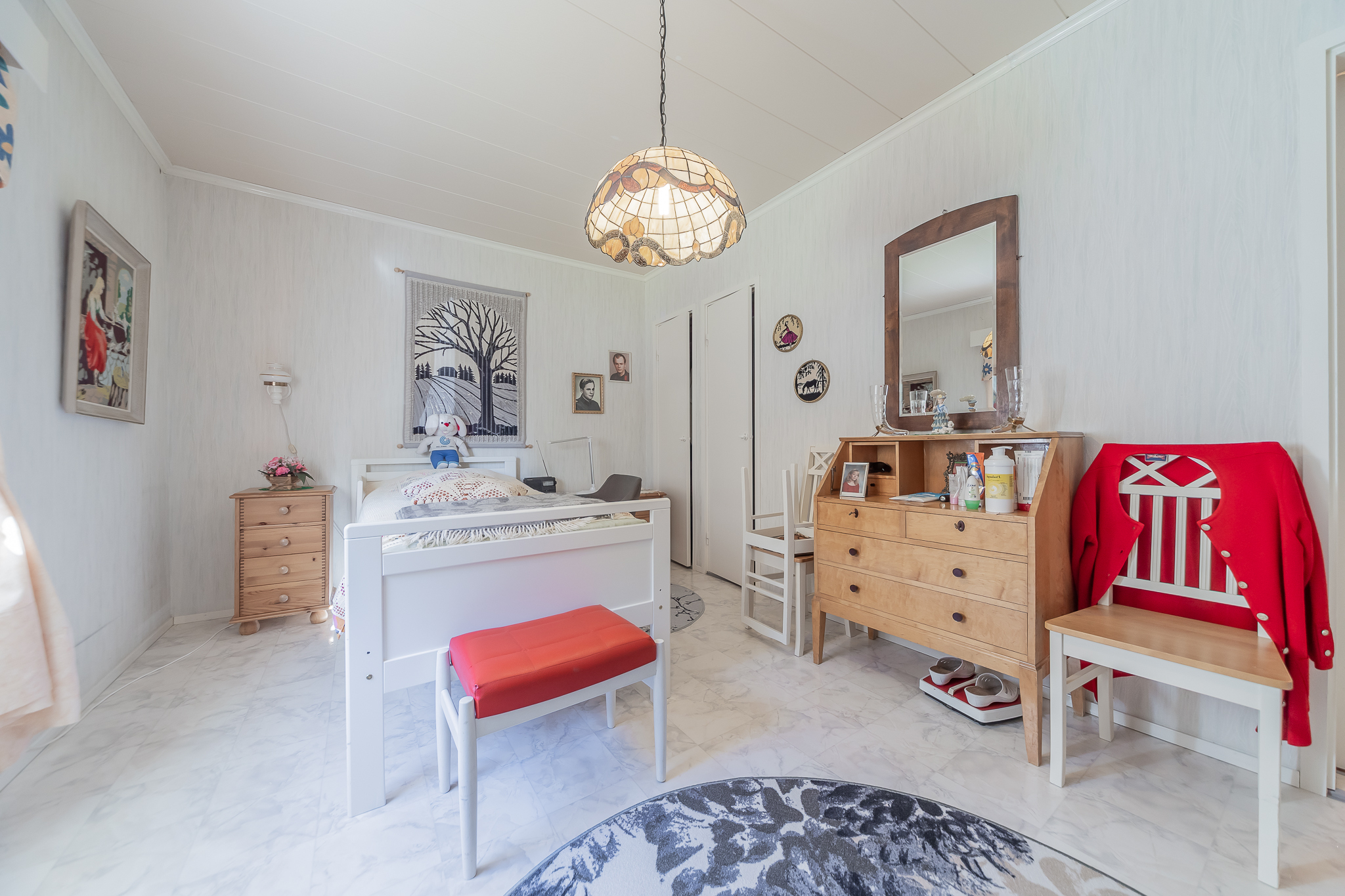 Talossa on kaksi makuuhuonetta, molemmissa kaapistoa, lisäksi takkahuonetta on tarpeen tullen käytetty makuuhuoneena. Takkahuoneessa on avotakka ja takkahuoneen yhteydessä se kaikenkätkevä vaatehuone.