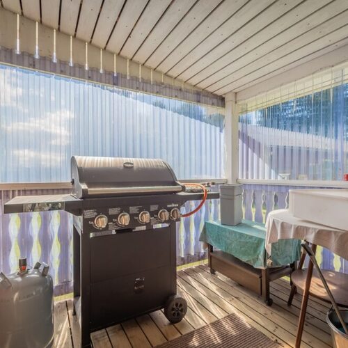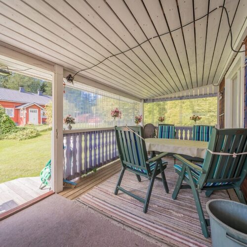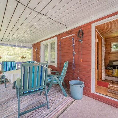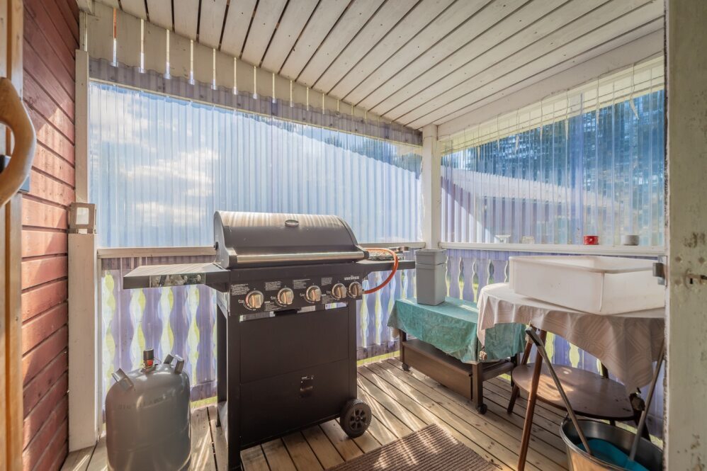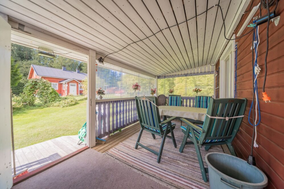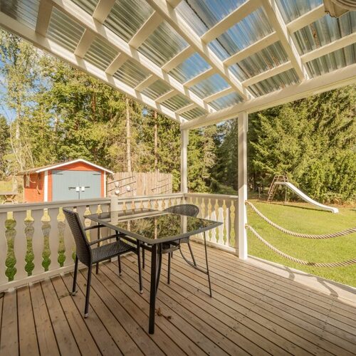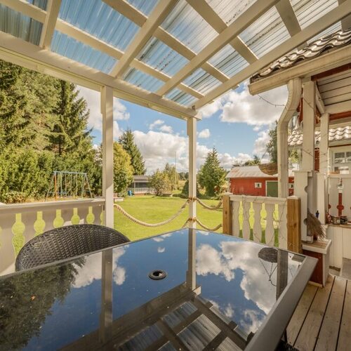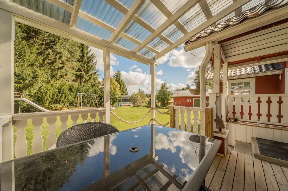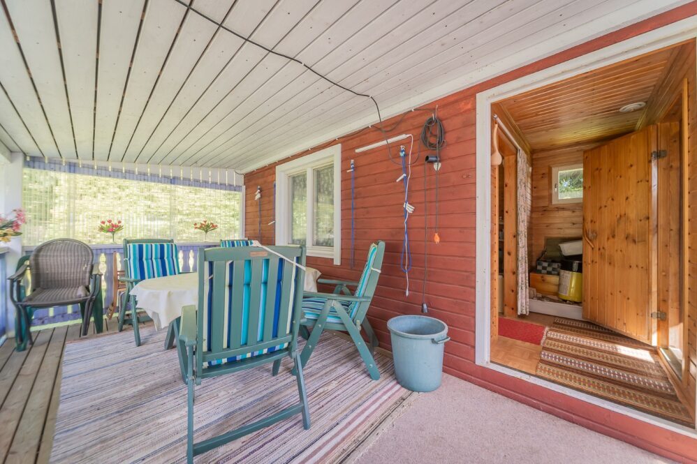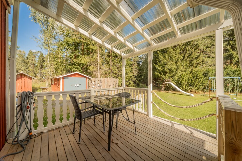 talon edessä vuonna 2022 rakennettu katettu terassi, saunarakennuksen edessä katettu terassi