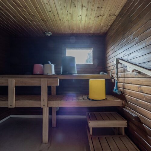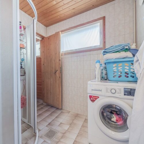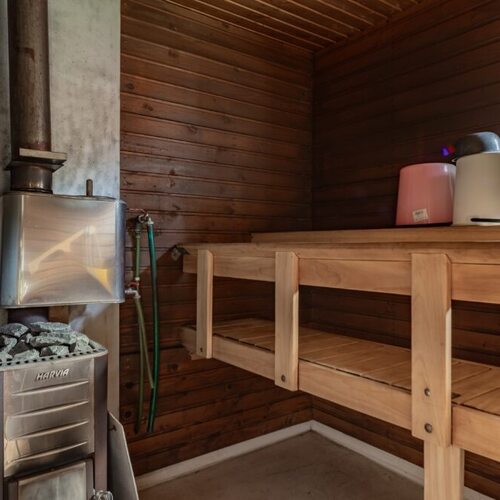 Sauna rakennettu 1992, sähkölämmitteinen kiuas, ikkuna, seinillä paneeli, laattalattia