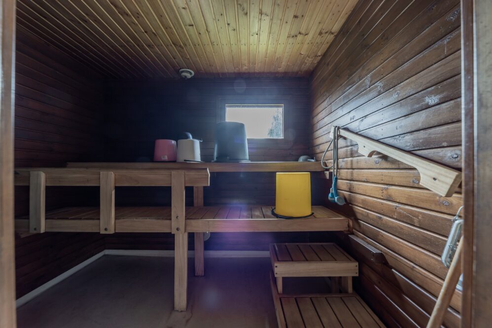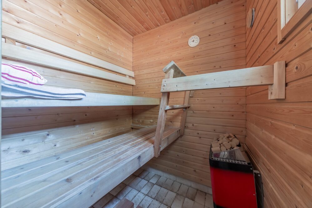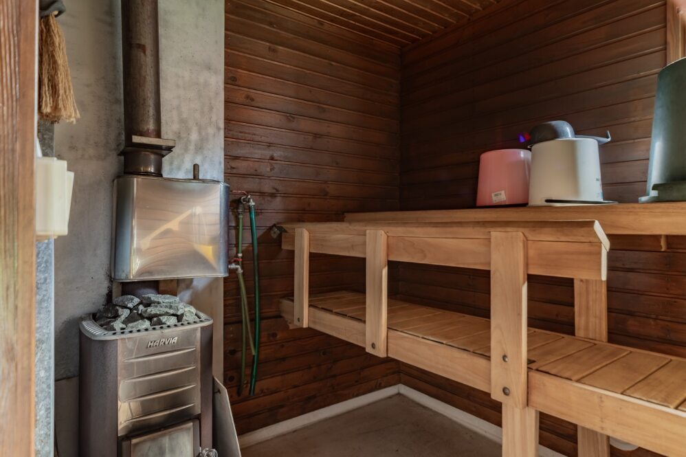 Pihapiirissä on upea pihasauna idyllisine saunakamareineen. Saunan muhevat löylyt tarjoaa puulämmitteinen kiuas. Vilvoittelemaan pääsee saunarakennuksen eteen rakennetulle katetulle terassille.