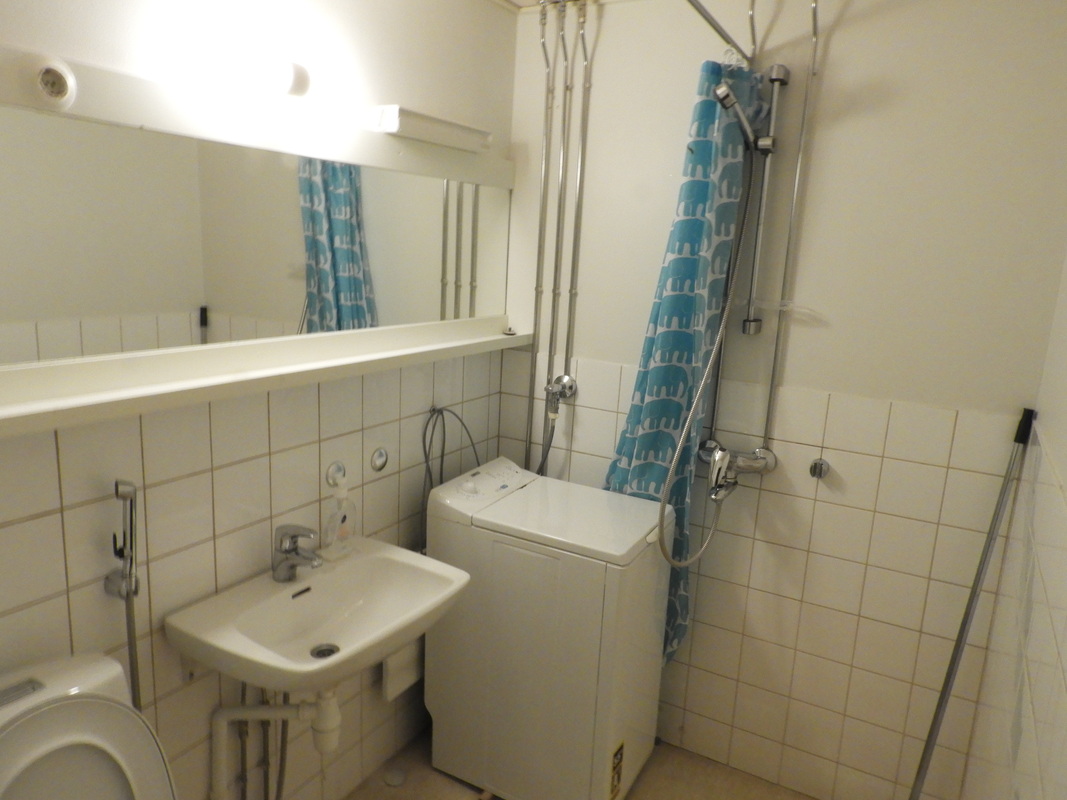 Varusteet: lattiaan asennettu WC, pesukoneliitäntä, peili