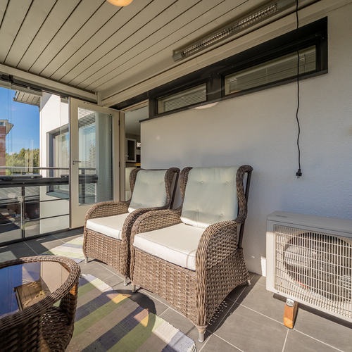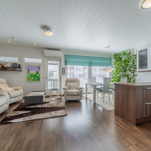 Keittiö avautuu suureen olohuoneeseen, jonne on asennettu ilmalämpöpumppu viilentämään helteisiä hetkiä. Olohuoneesta on käynti lasitetulle, isolle lännensuuntaiselle parvekkeelle.