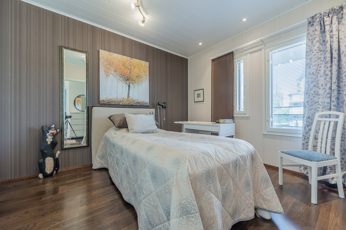 Asunnossa on kolme makuuhuonetta, yhdessä kaapiston lisäksi ikkunallinen vaatehuone, lisäksi toisessa on hyllykkö tarpeellisten tavaroiden säilytykseen.