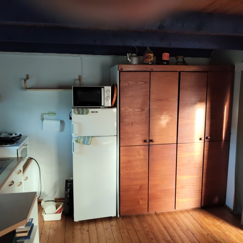 Pienois-sähköliesi, jääkaappi, alakaapisto ja hyllyt.