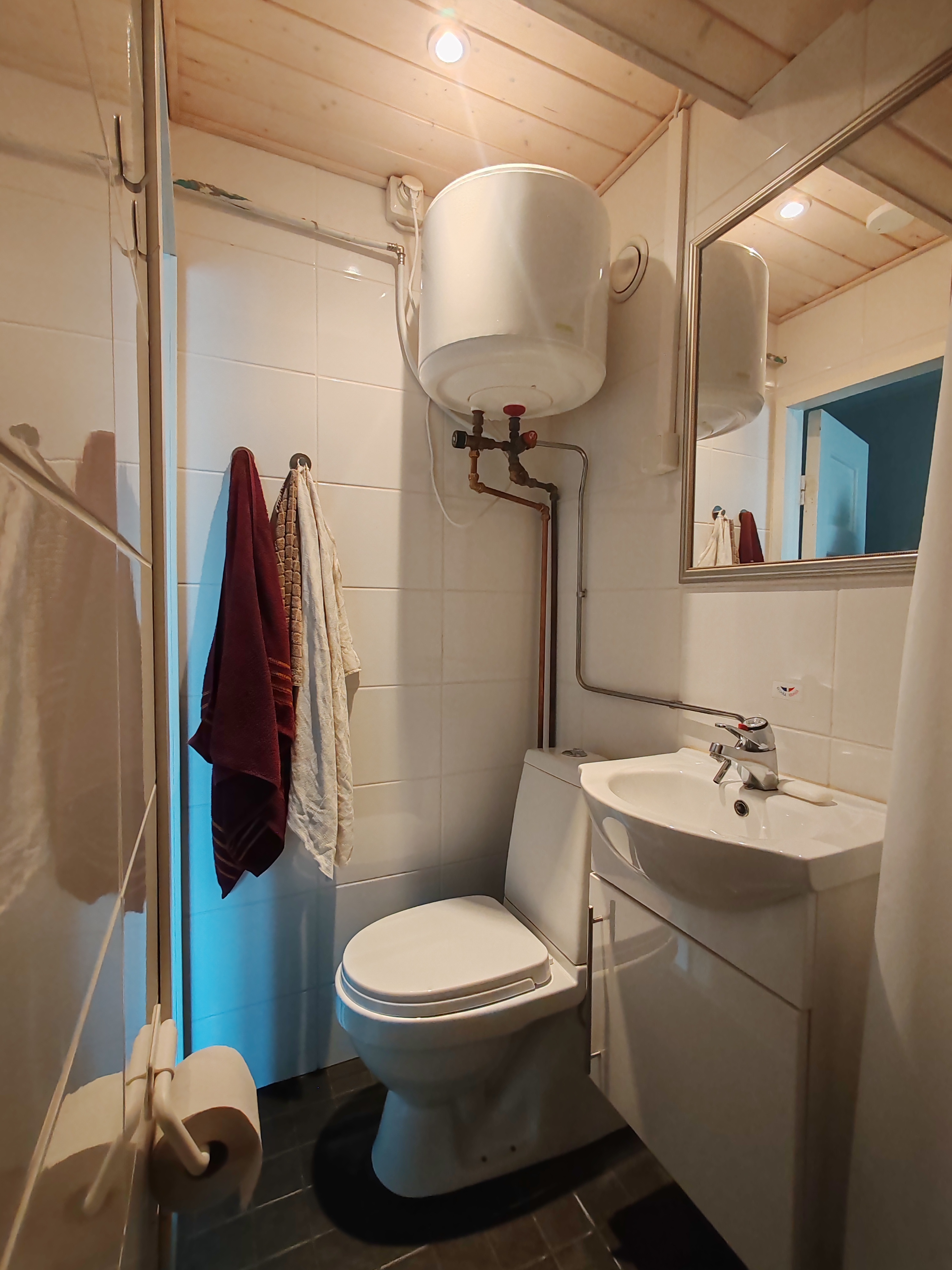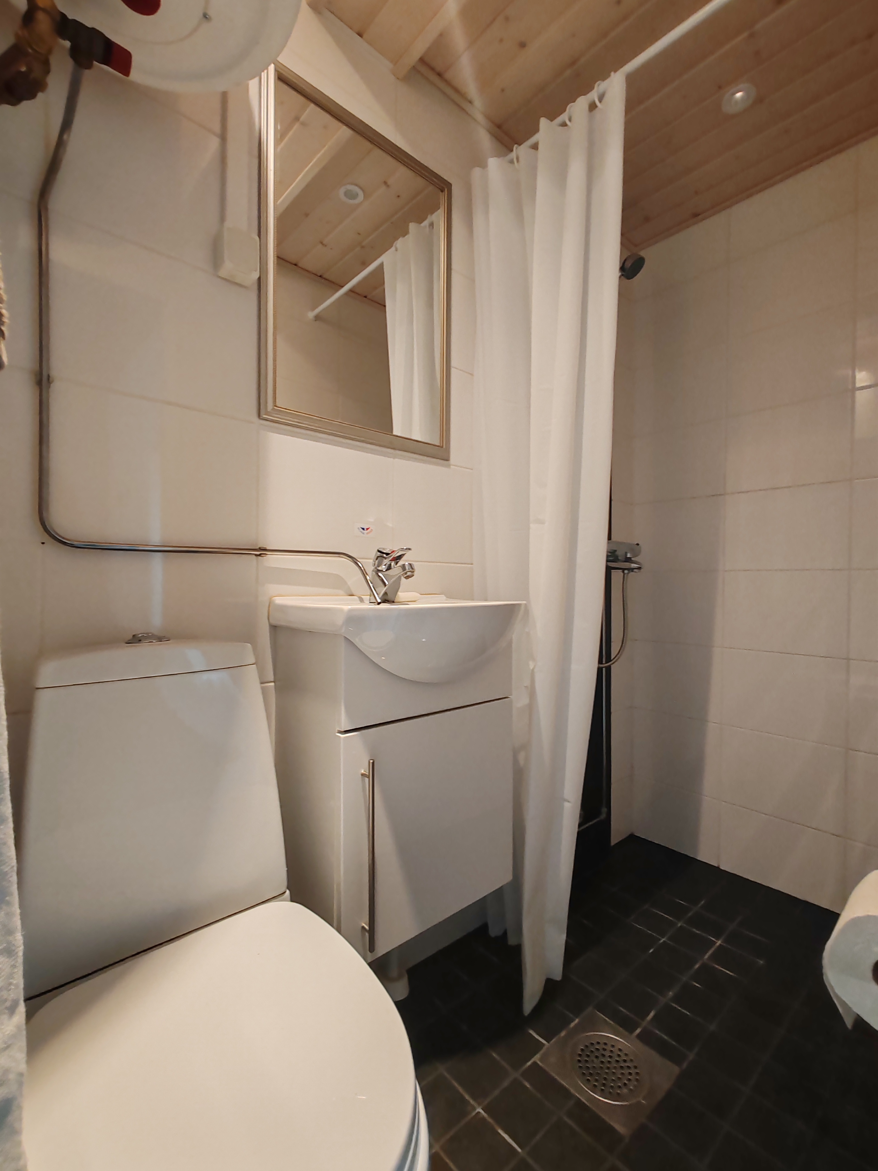 Varusteet: suihku, lattialämmitys, kiinteät valaisimet, allaskaappi, peili