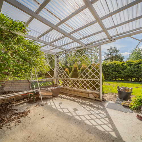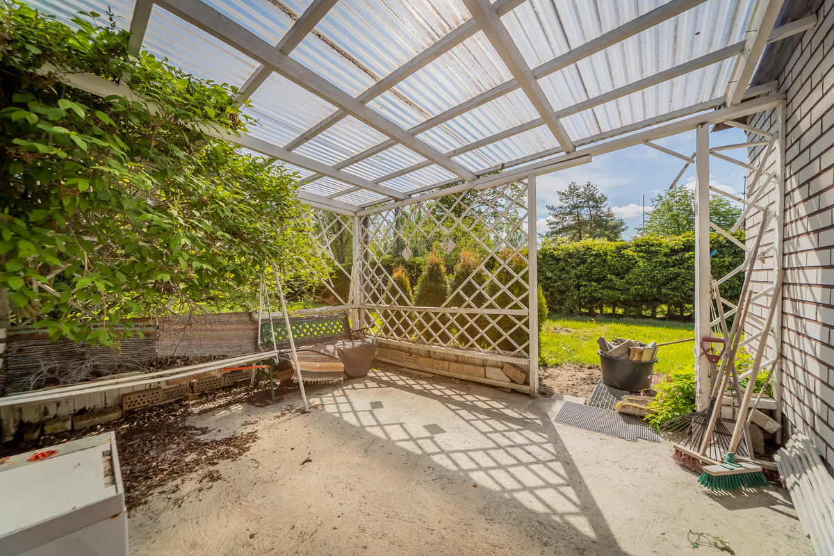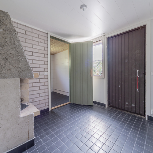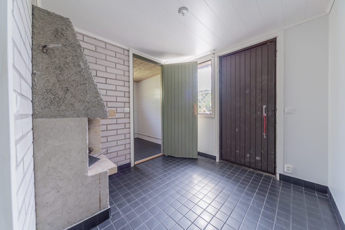 takkahuoneesta käynti reilunkokoiselle katetulle terassille
