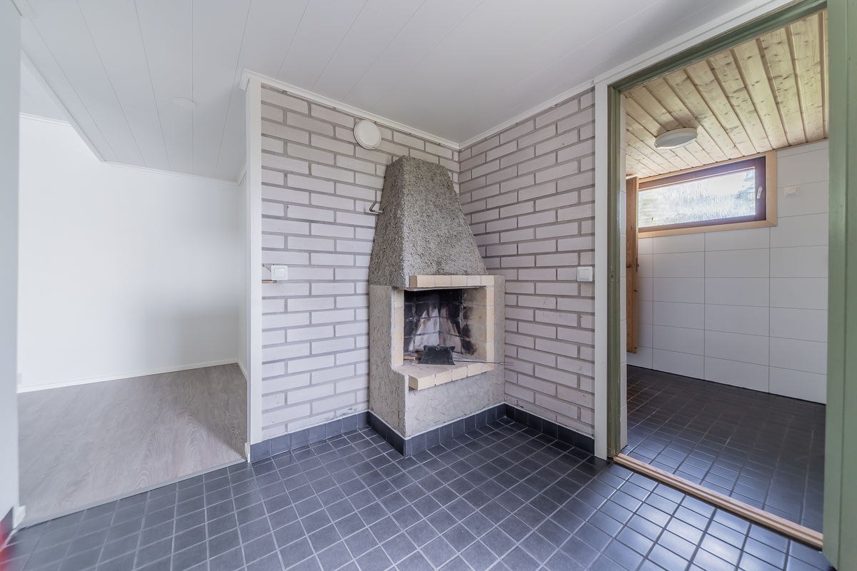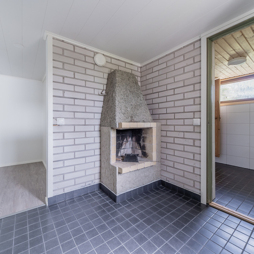 takkahuoneessa avotakka, käynti katetulle terassille, seinillä tiili/maali, laattalattia