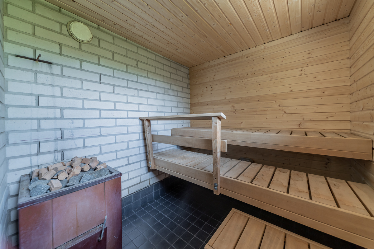 Ikkuna, puilla lämpiävä kiuas, seinillä paneeli, laattalattia