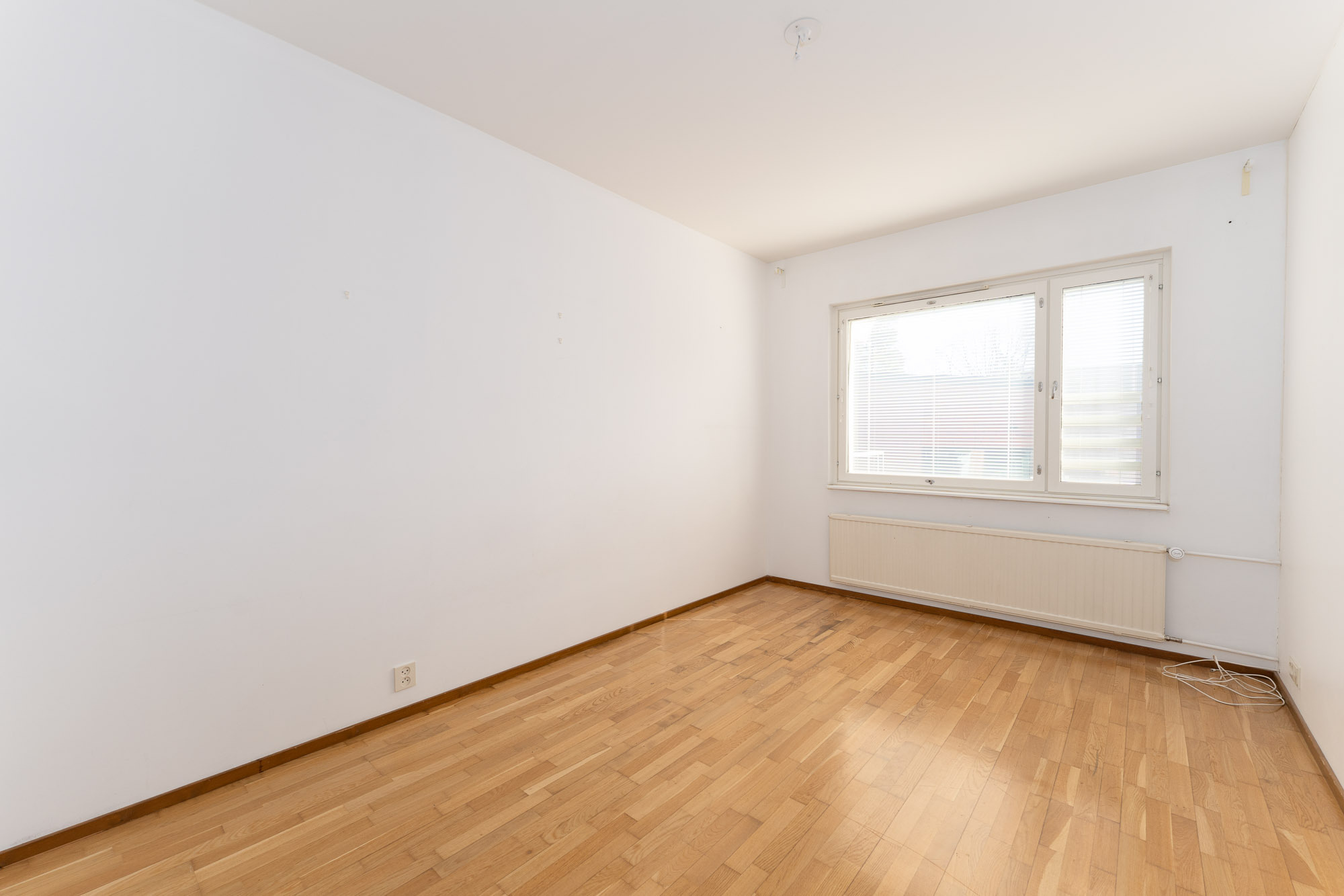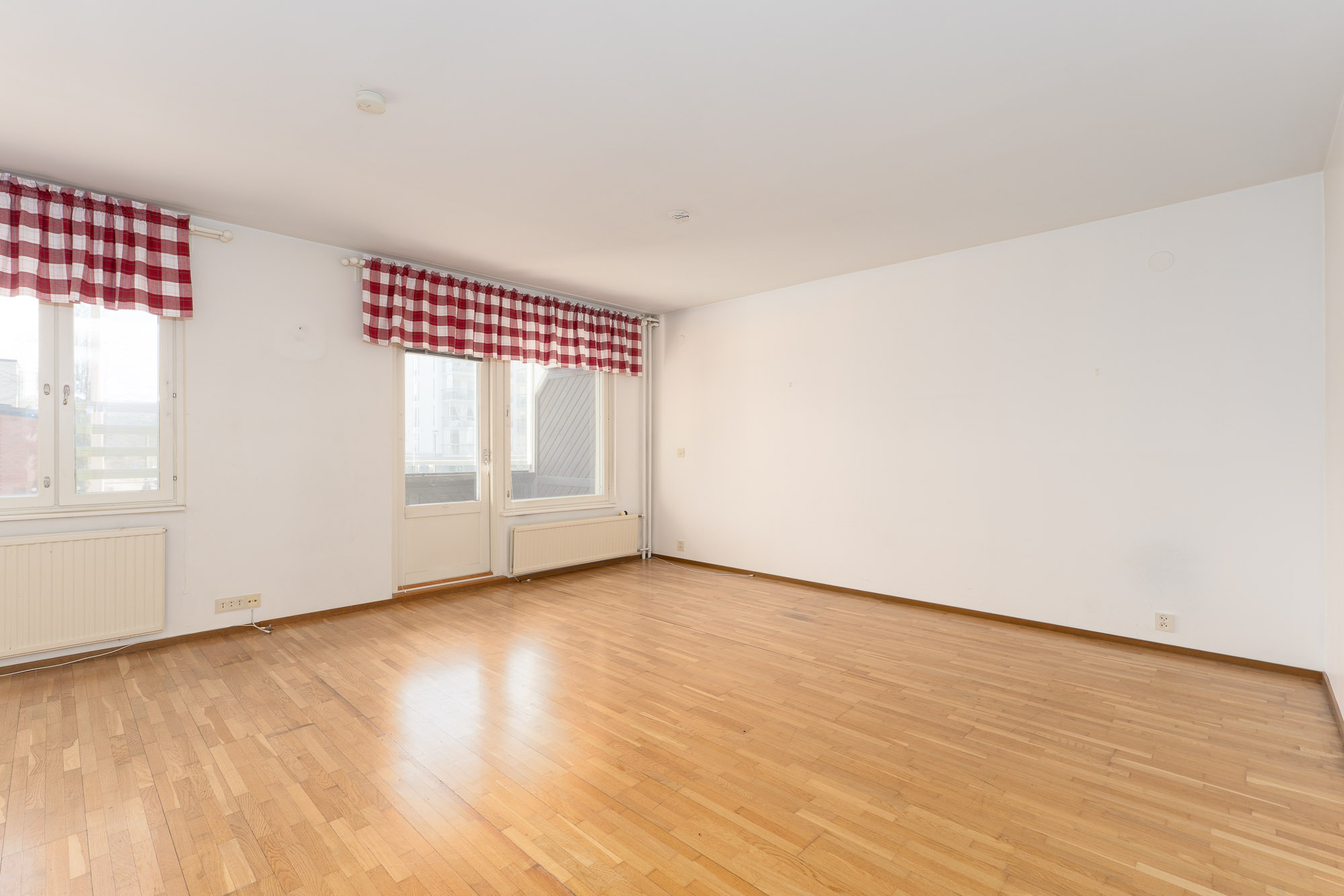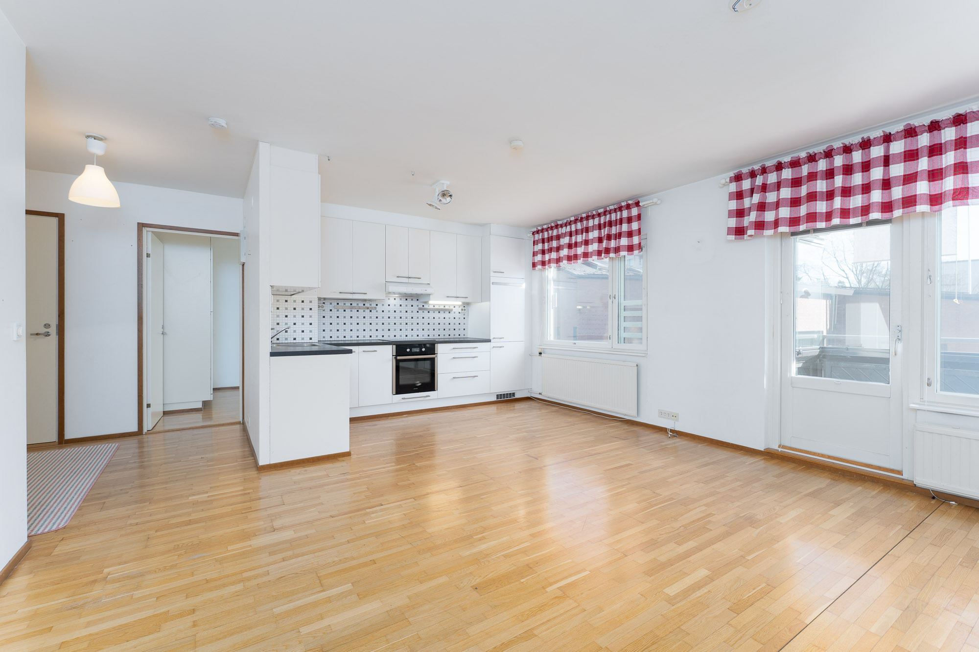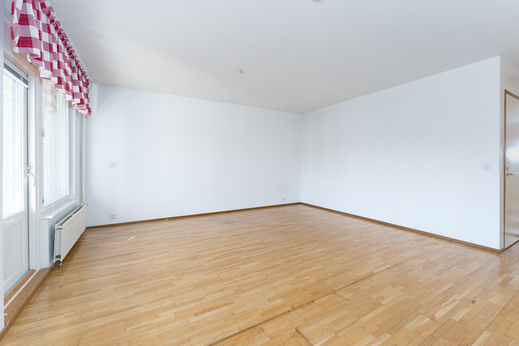 Lattia parkettia, seinät ja katto maalattu. Käynti parvekkeelle. Sälekaihtimet.