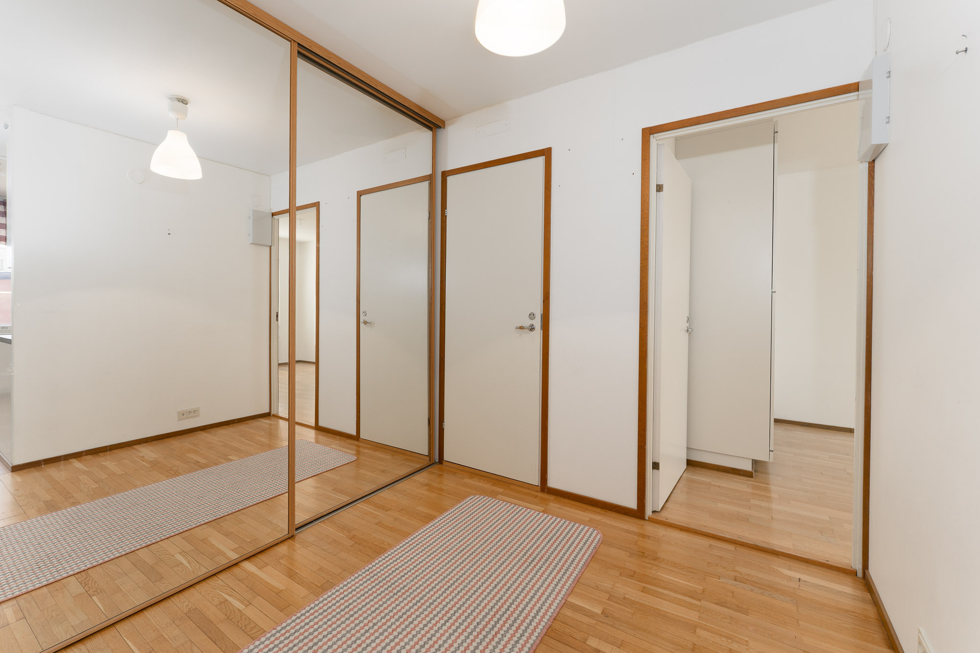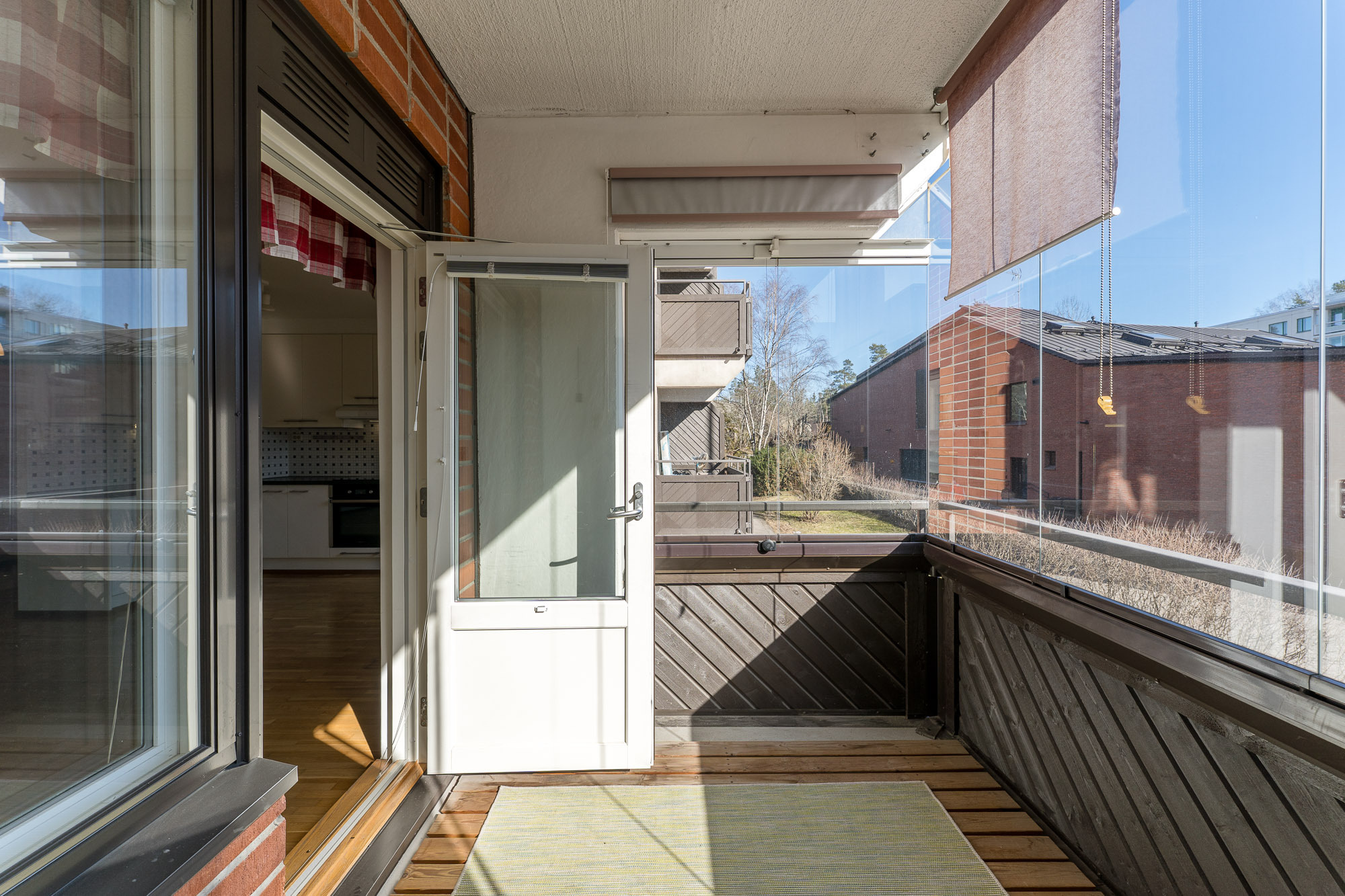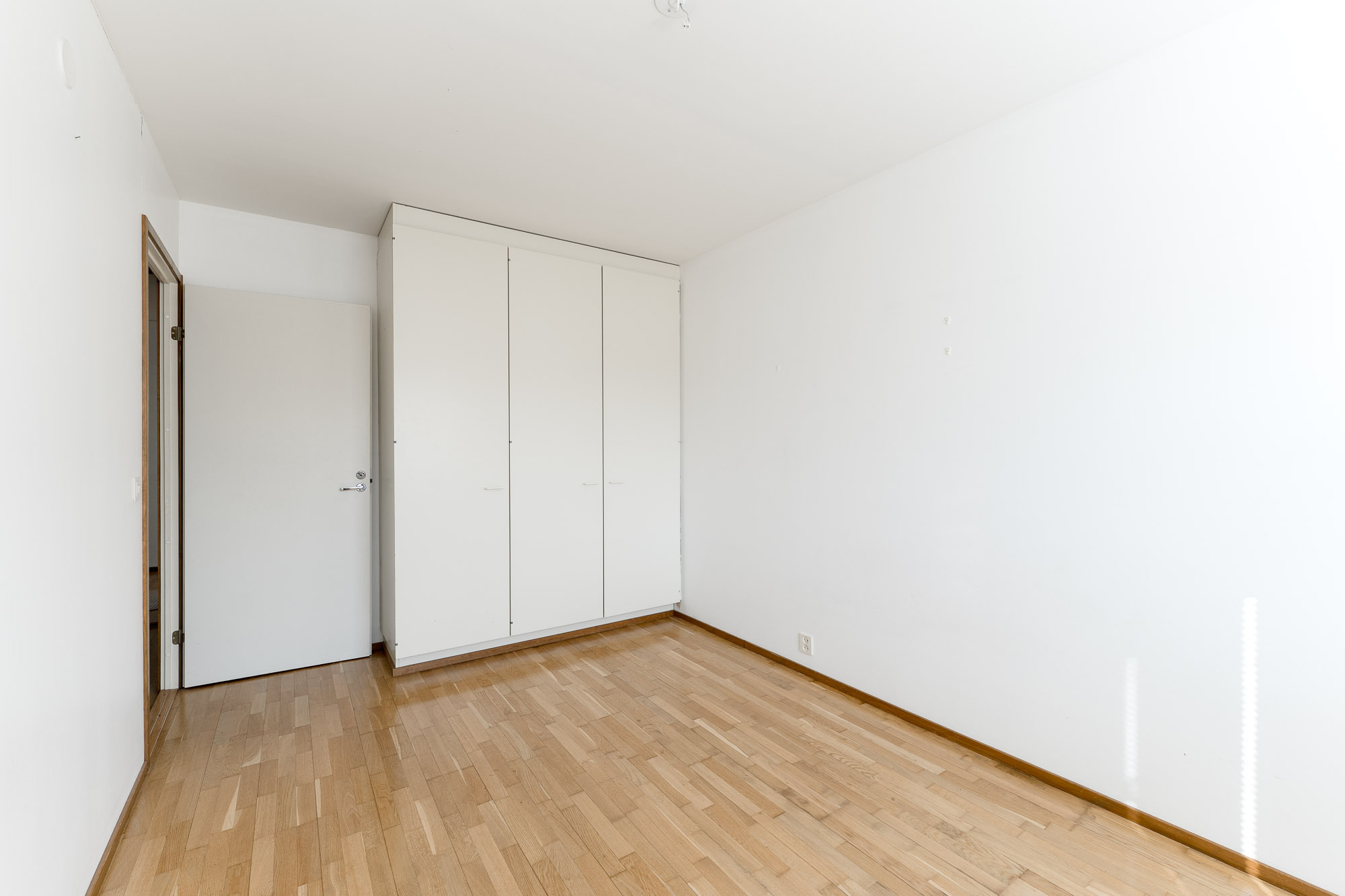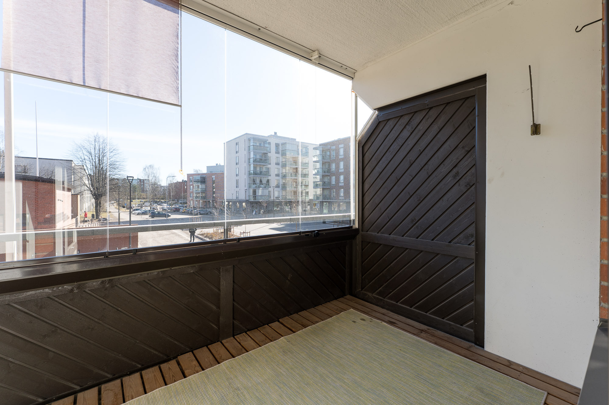 Lattia parkettia, seinät ja katto maalattu. Käynti parvekkeelle. Sälekaihtimet.