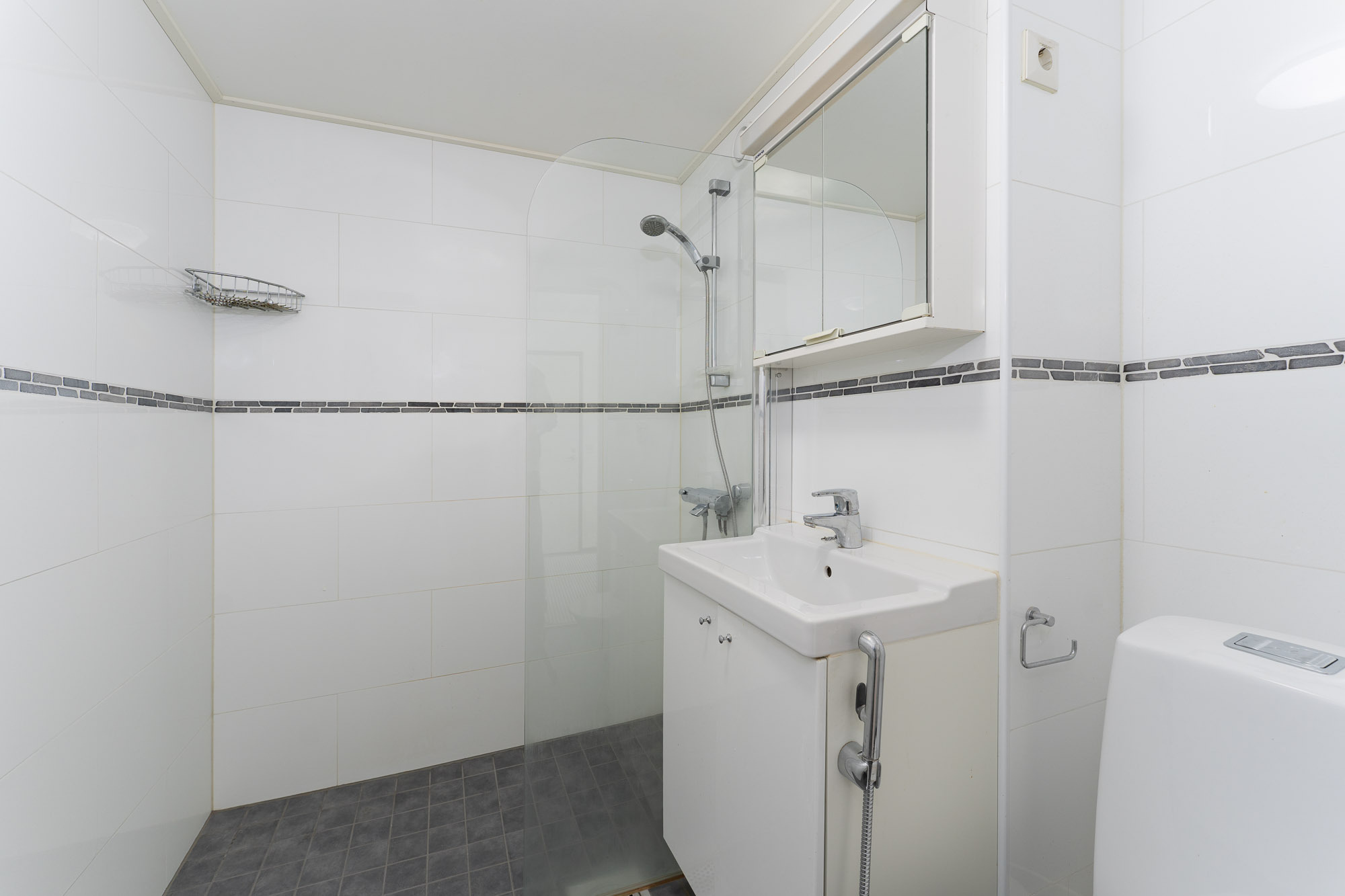 Suhkuseinä, allaskaappi, peilikaappi, bidé, wc-istuin. Lattia ja seinät laatoitettu.