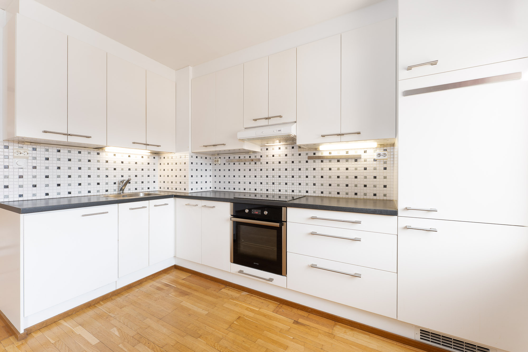 Keraaminen liesi, erillisuuni, liesituuletin, jääpakastinkaappi, kaapistot. Lattia parketti, seinät ja katto maalattu.