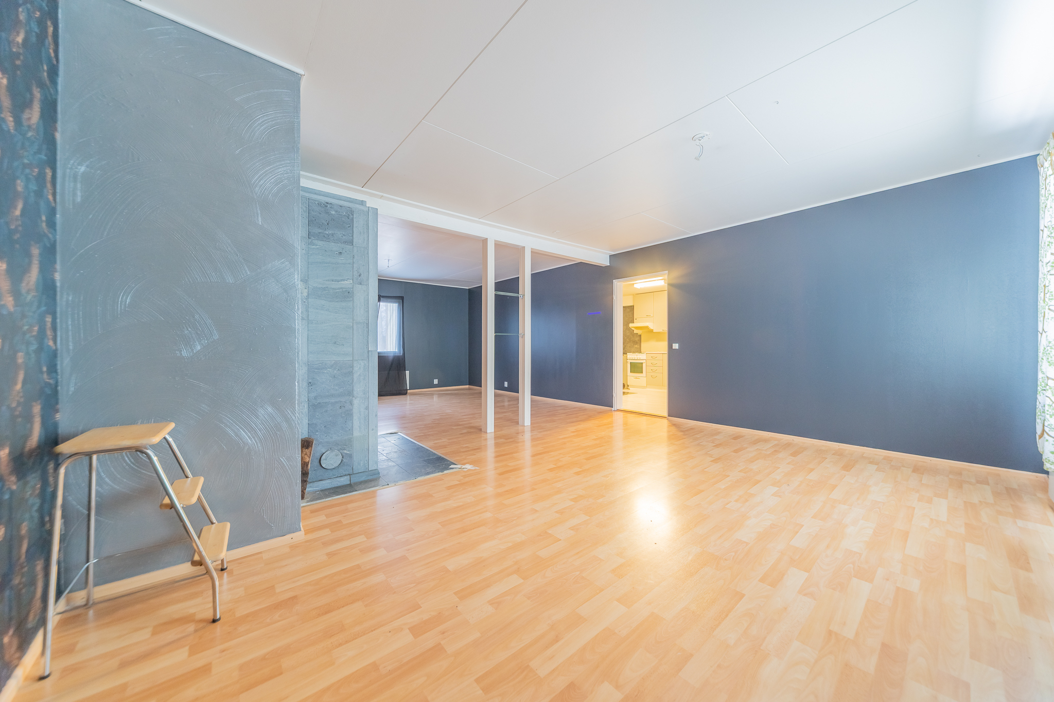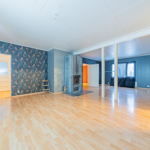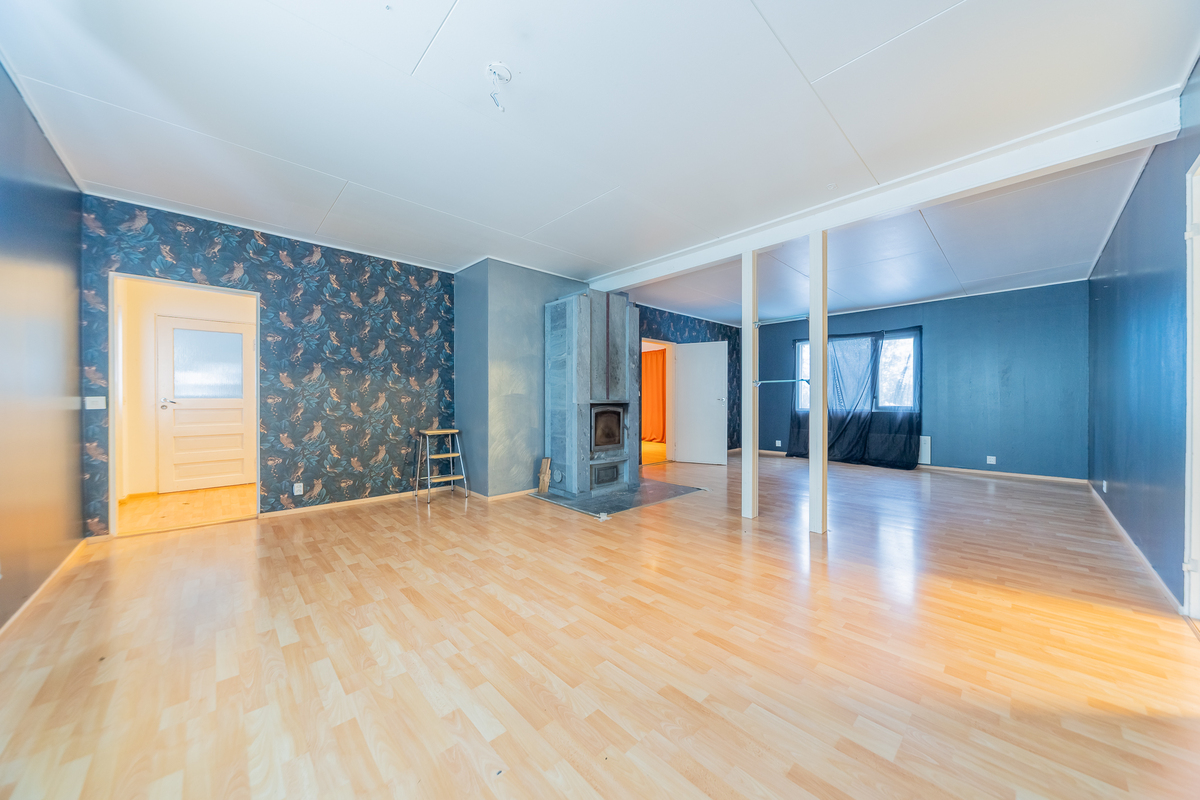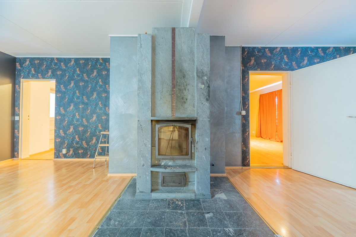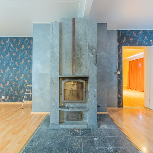Olohuoneeseen on yhdistetty alakerran toinen makuuhuone, tila on nyt todella iso, läpitalon huone, jossa keskeisellä paikalla on varaava takka.