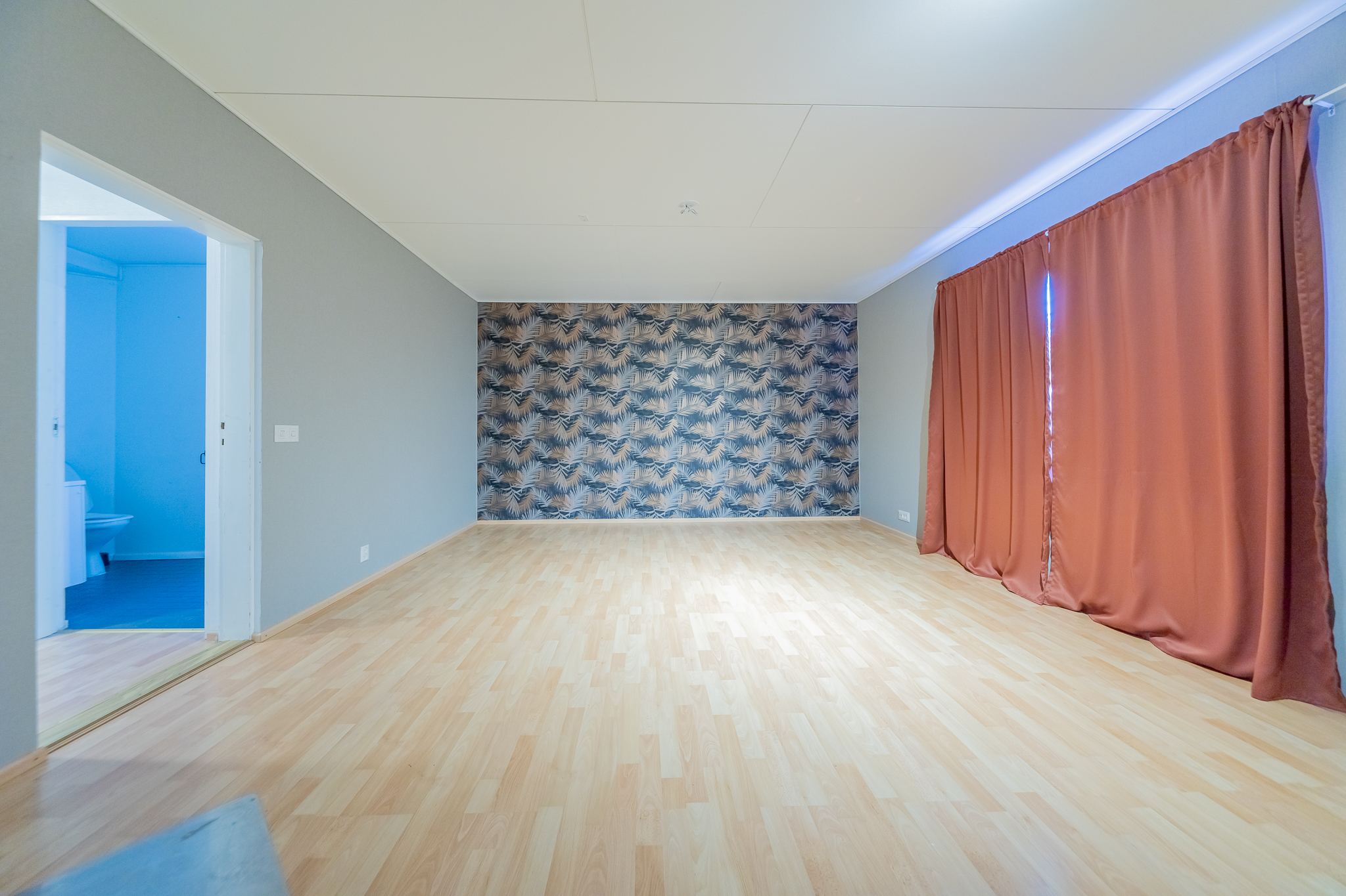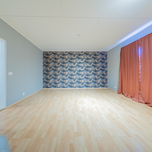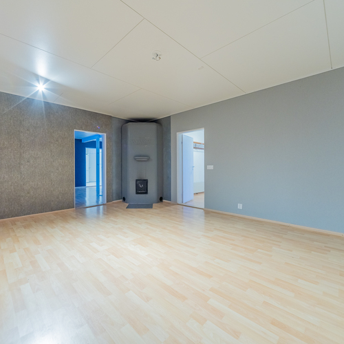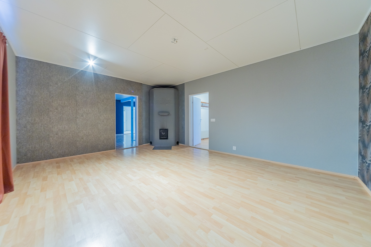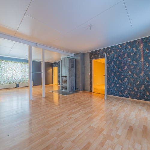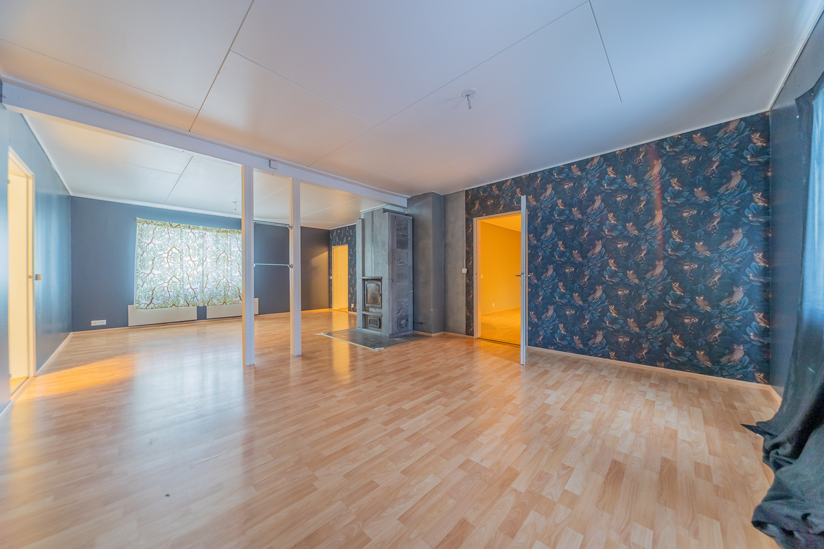 Olohuoneeseen on yhdistetty alakerran toinen makuuhuone, tila on nyt todella iso, läpitalon huone, jossa keskeisellä paikalla on varaava takka.