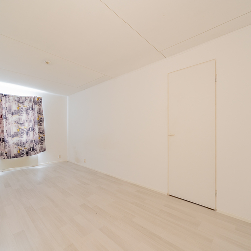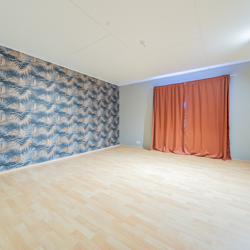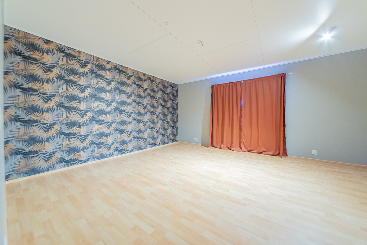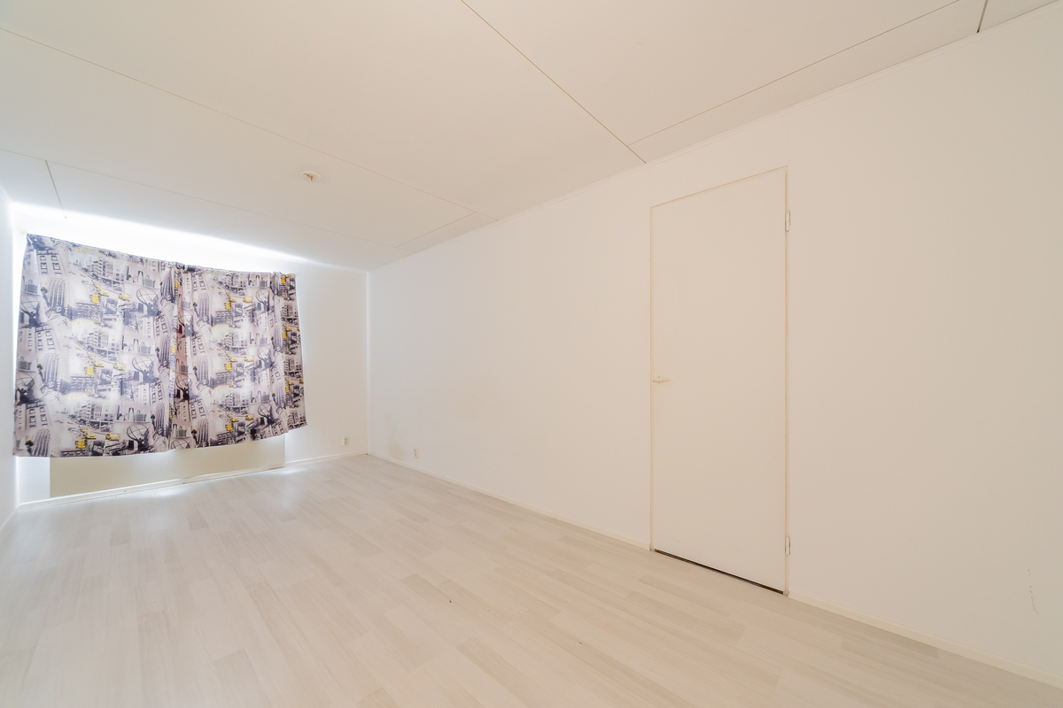 Alakerran makuuhuone on reilunkokoinen ja huoneen nurkassa on varaava takka.