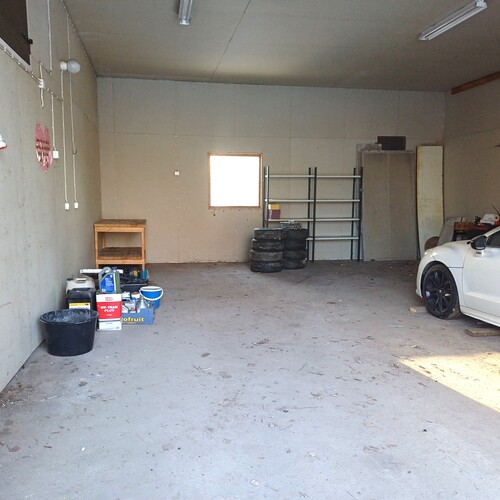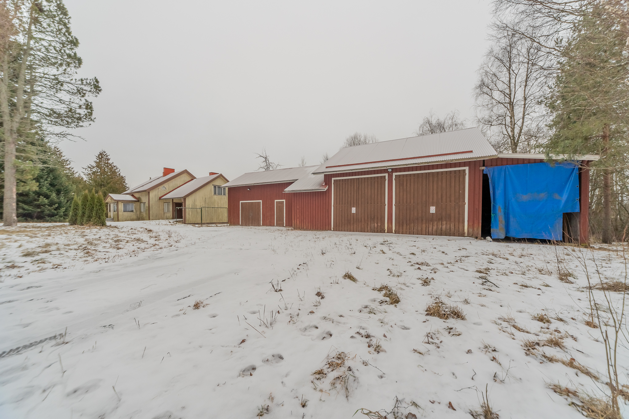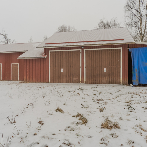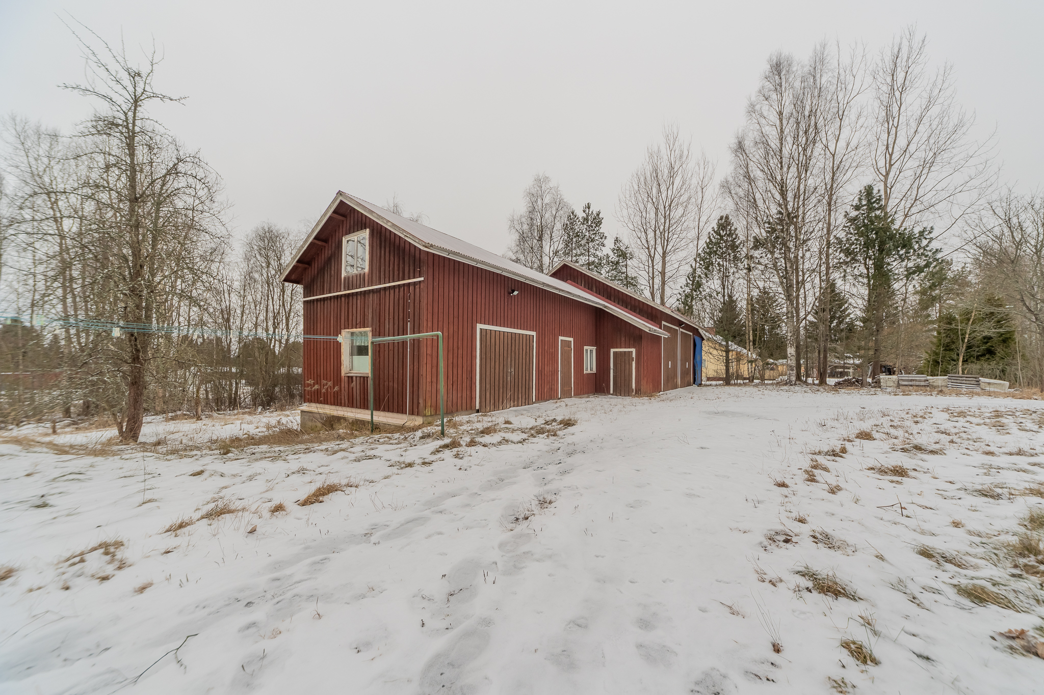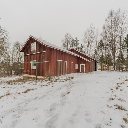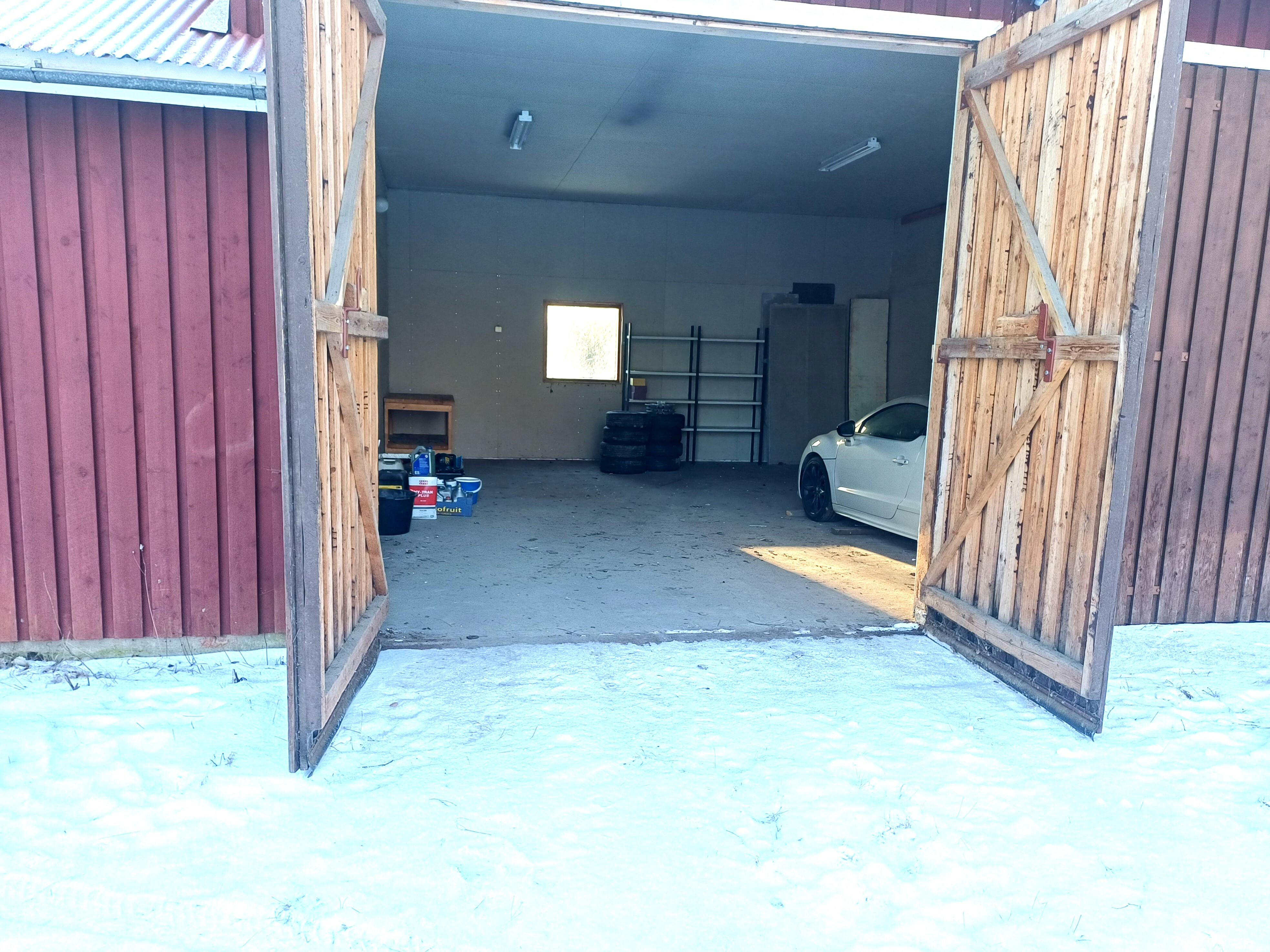 Oma 2419 m²:n tontti. Pihapiirissä iso konehalli, vieressä autotalli, varasto ja katos.
