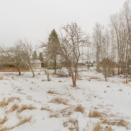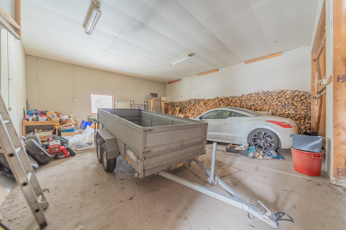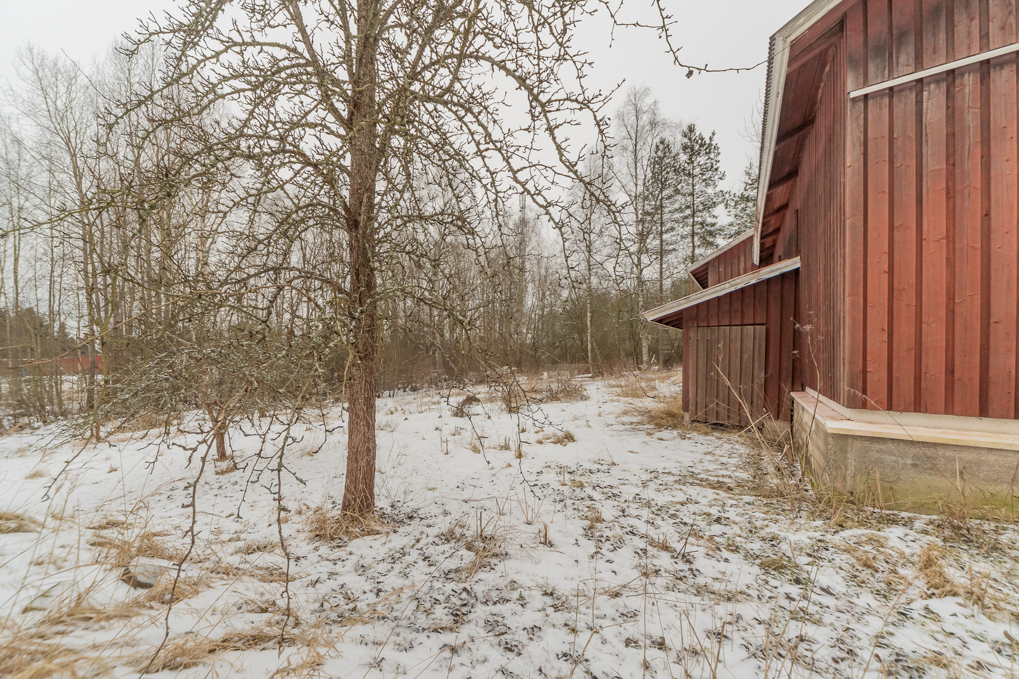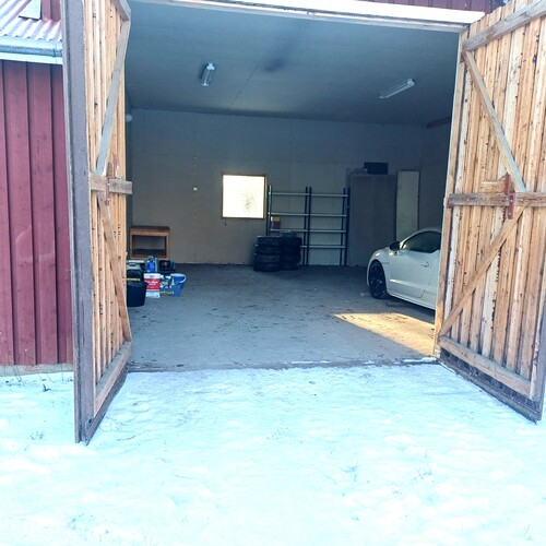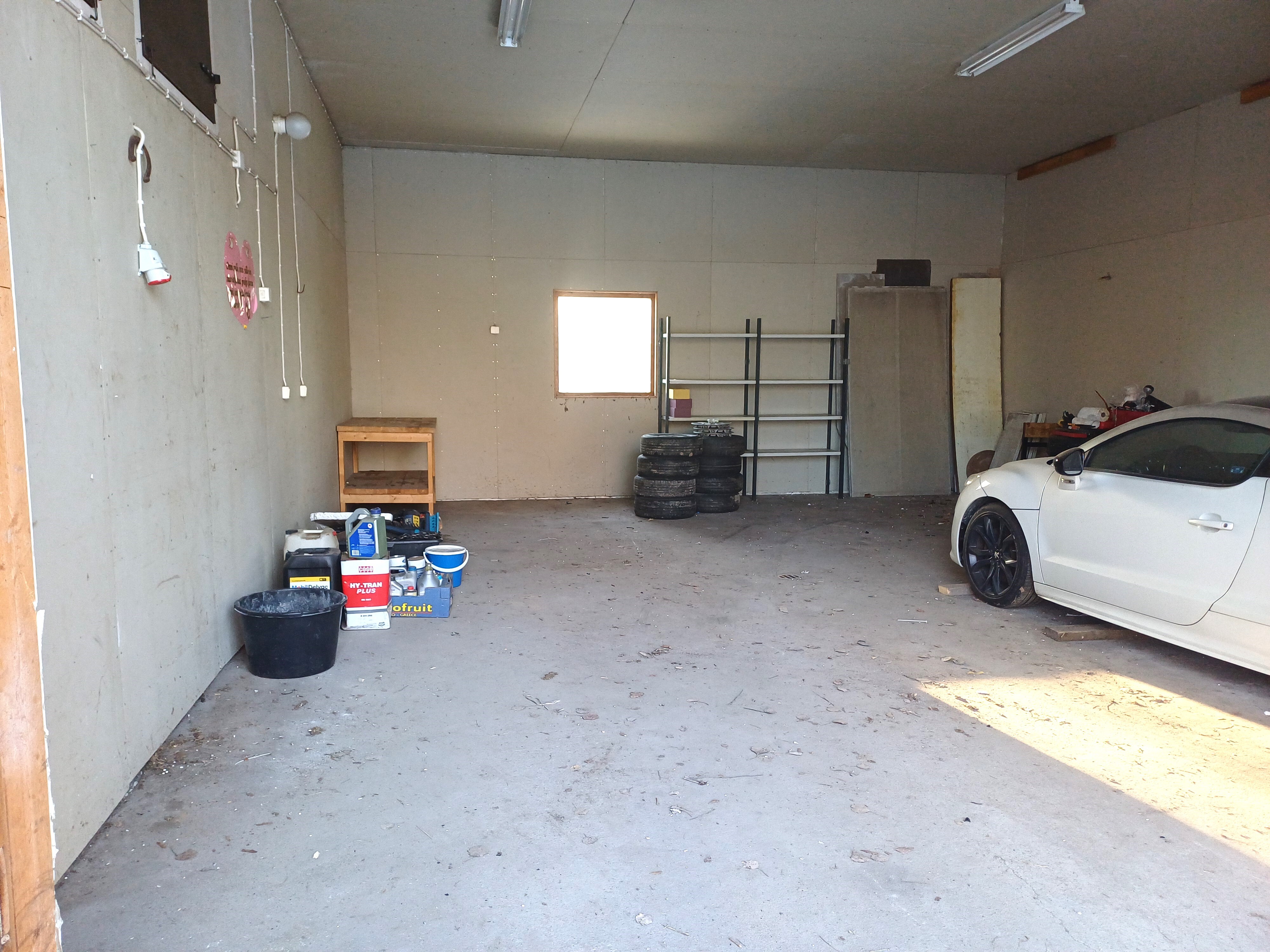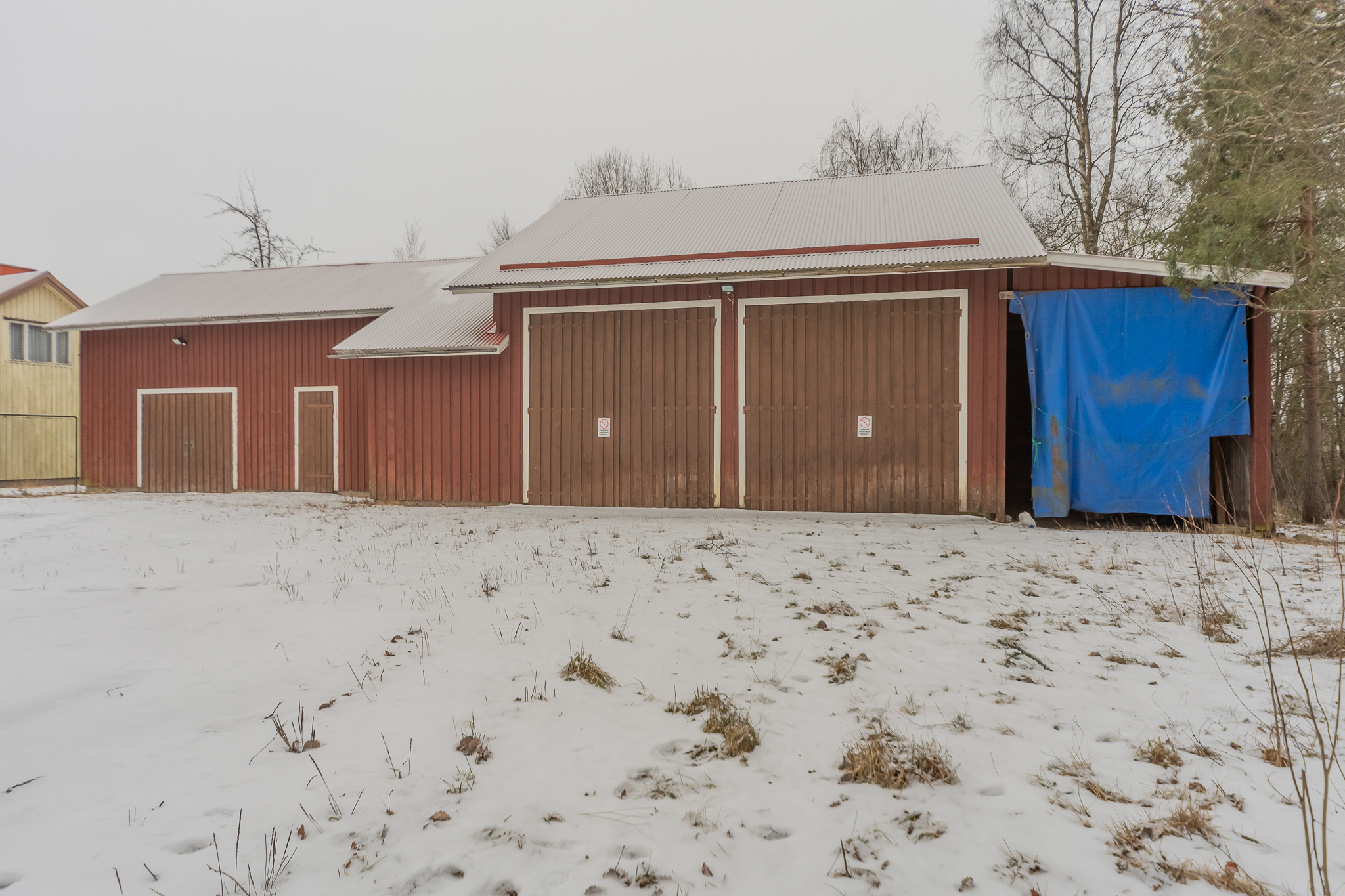 Oma 2419 m²:n tontti. Pihapiirissä iso konehalli, vieressä autotalli, varasto ja katos.