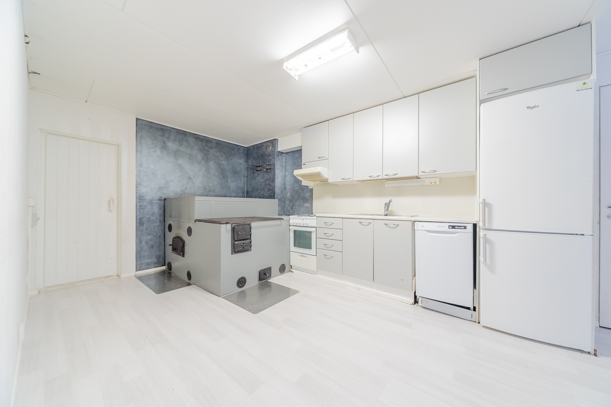 Keittiössä on puuhella-leivinuuni, vaaleasävyiset kaapistot, siistit kodinkoneet ja paikka reilunkokoiselle ruokapöydälle.