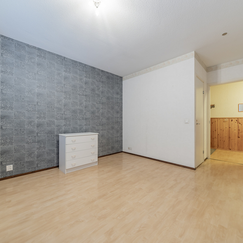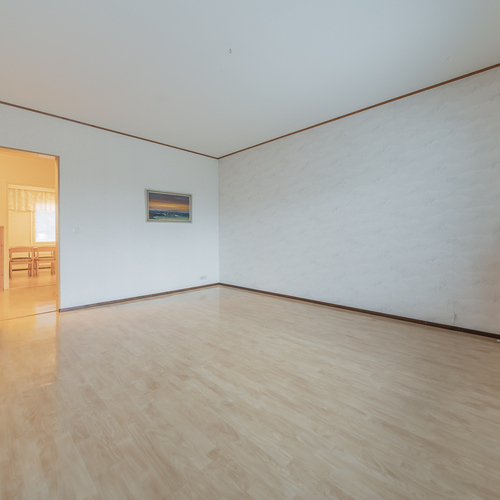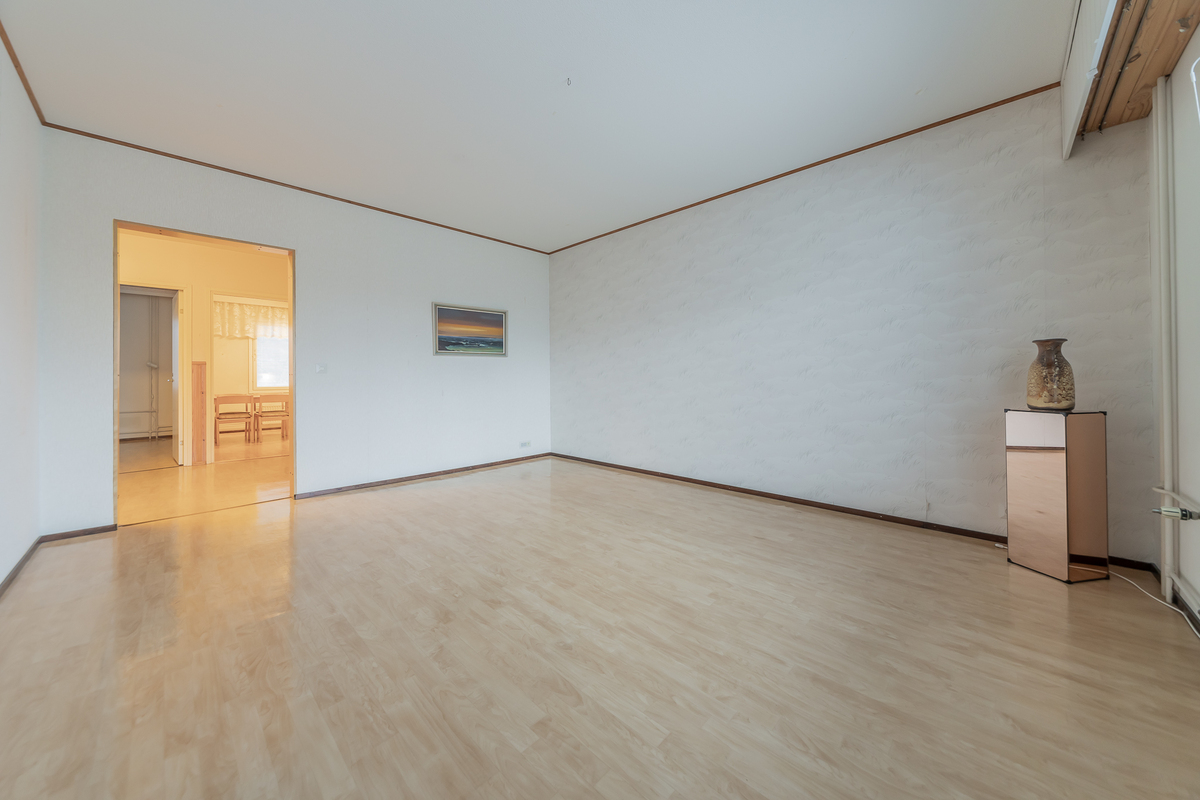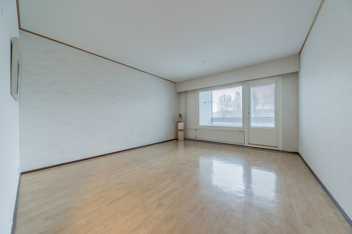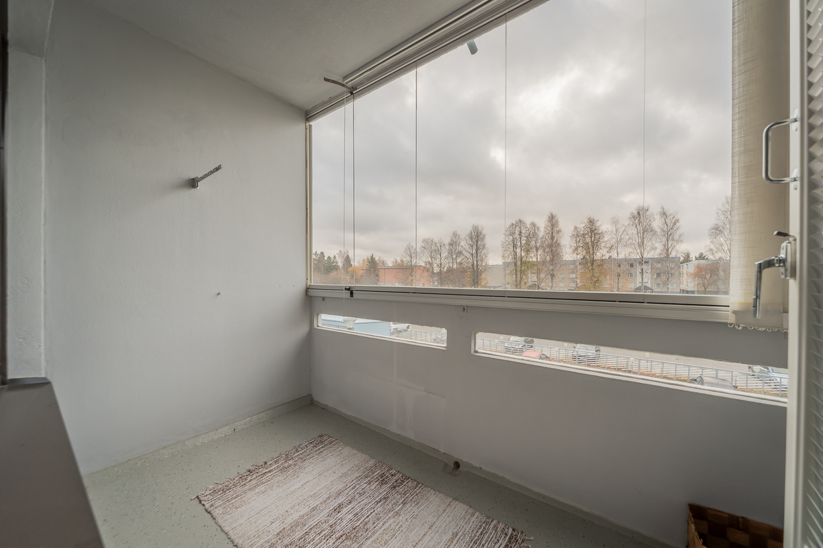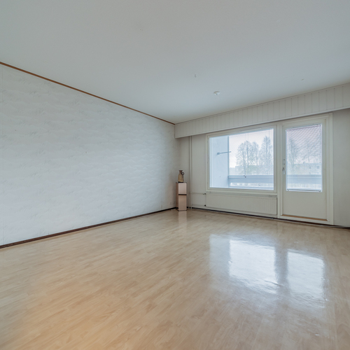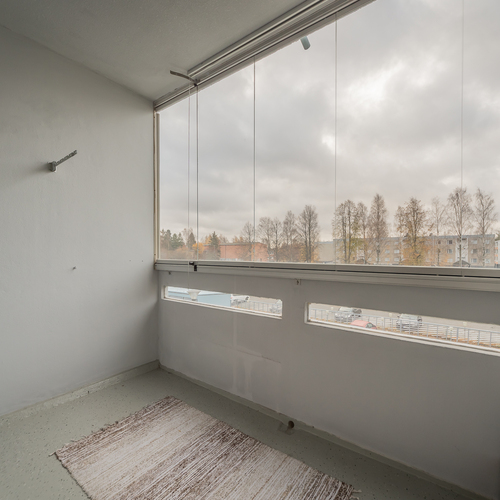 Seinillä tapetti, latttiassa muovimatto, olohuoneesta käynti lasitetulle eteläparvekkeelle, jossa lamelliverhot