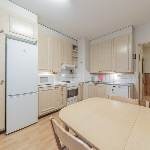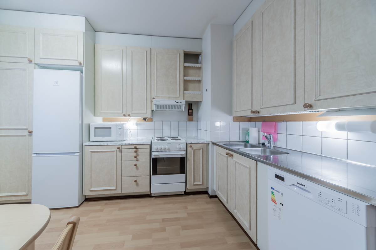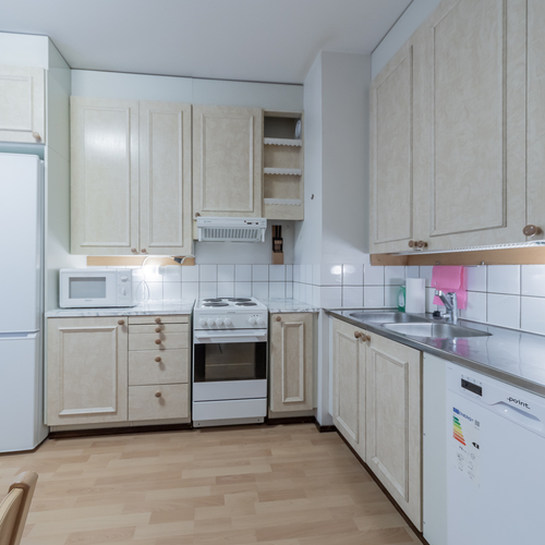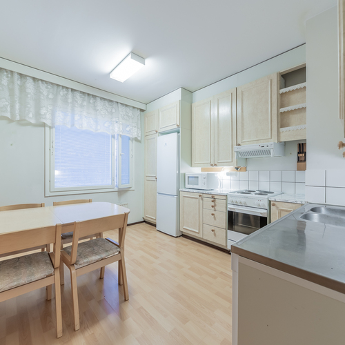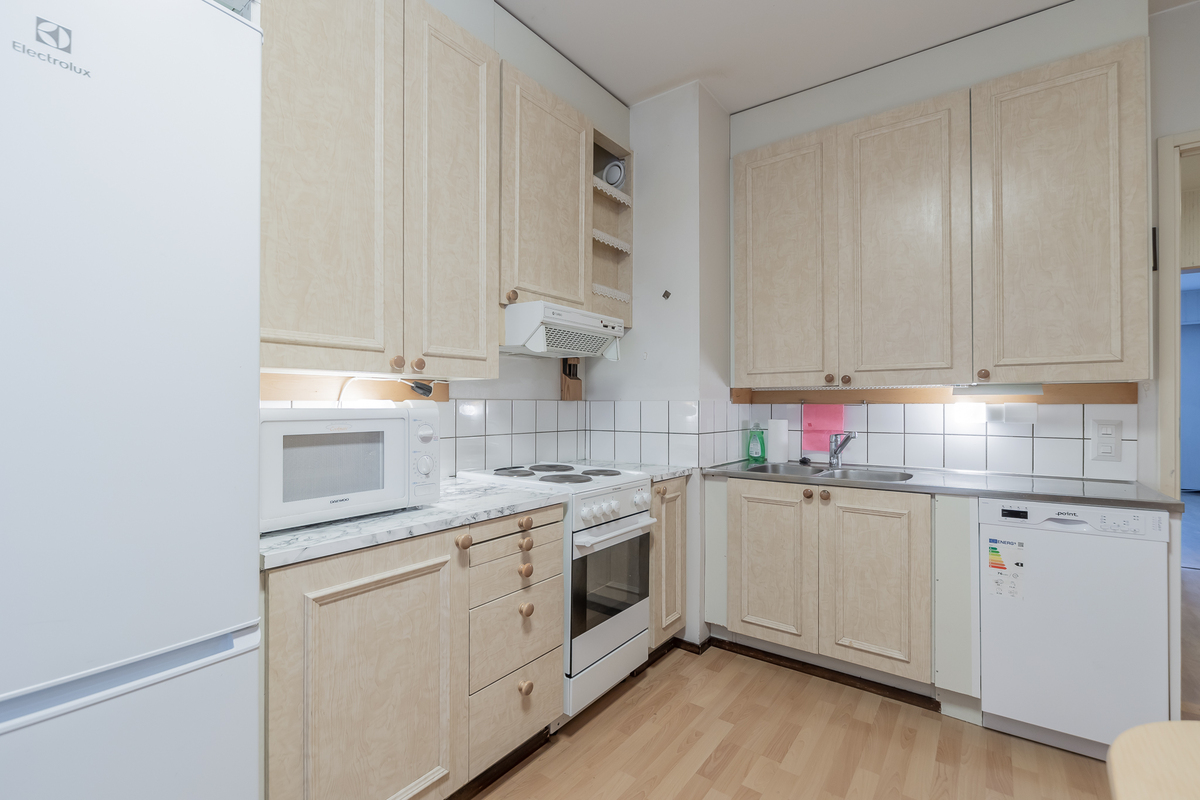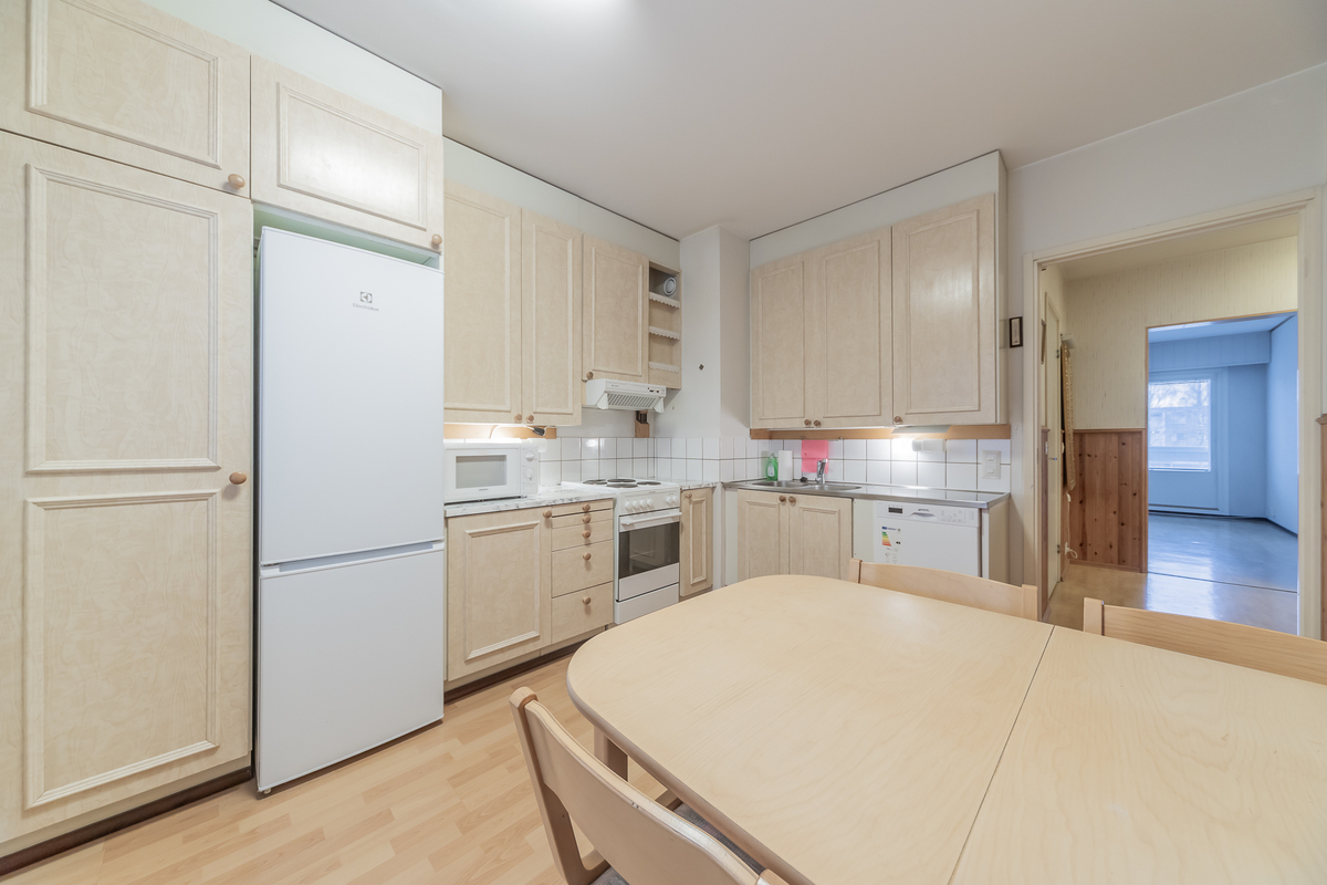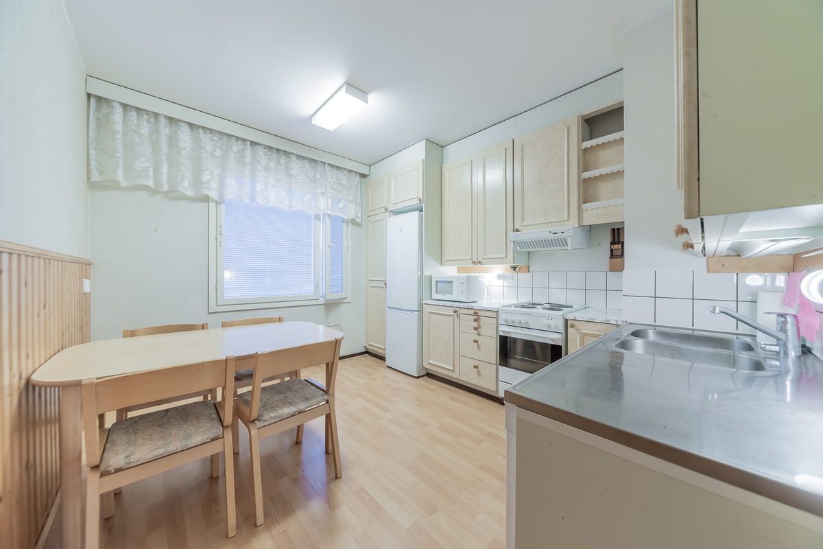 Vaaleassa keittiössä on osin uusia/uudehkoja kodinkoneita ja paikka ruokapöydälle.