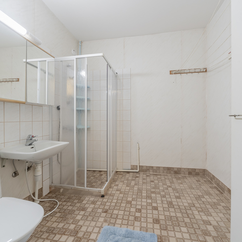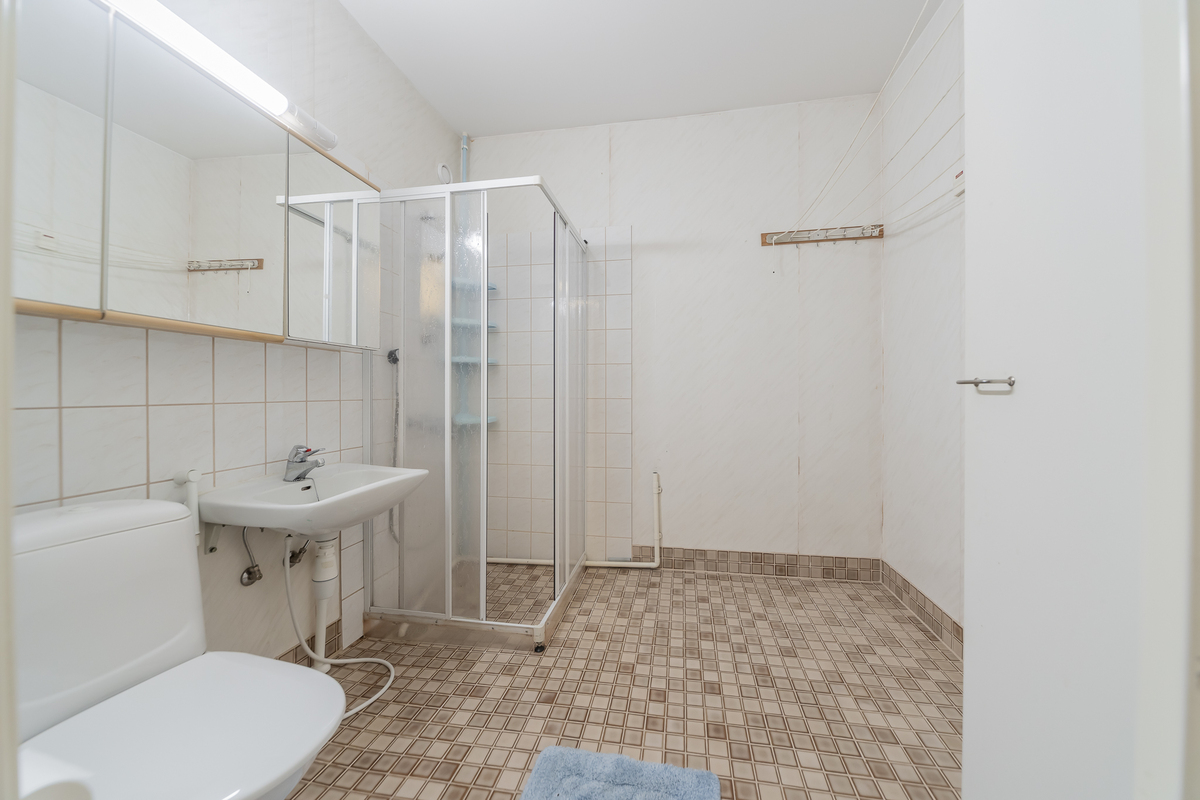 Suihku, suihkukaappi, peilikaappi, allas, pesukoneliitäntä, pyykinpesukone, wc-istuin, seinillä laatta/muovitapetti, laattalattia